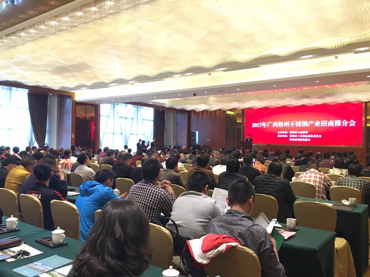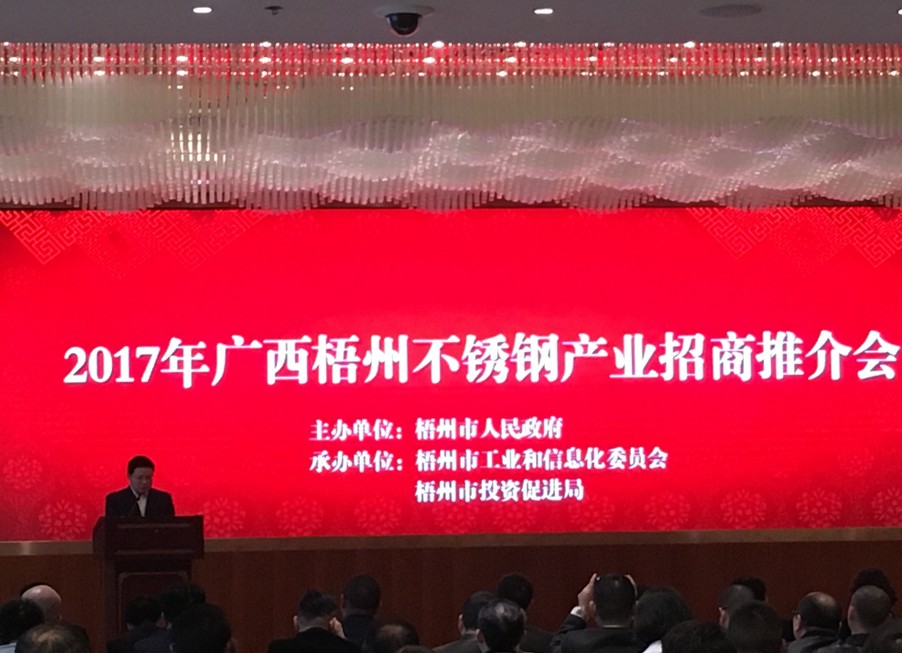 26日下午,2017年广西梧州不锈钢产业招商推介会在梧州市国龙大酒店6楼宴会厅举行,梧州市人民政府副市长姜云飞、中钢深圳公司总经理文翰旻、梧州市工信委、投促局和梧州各大银行负责人以及来自全国各地不锈钢企业家约180人出席。