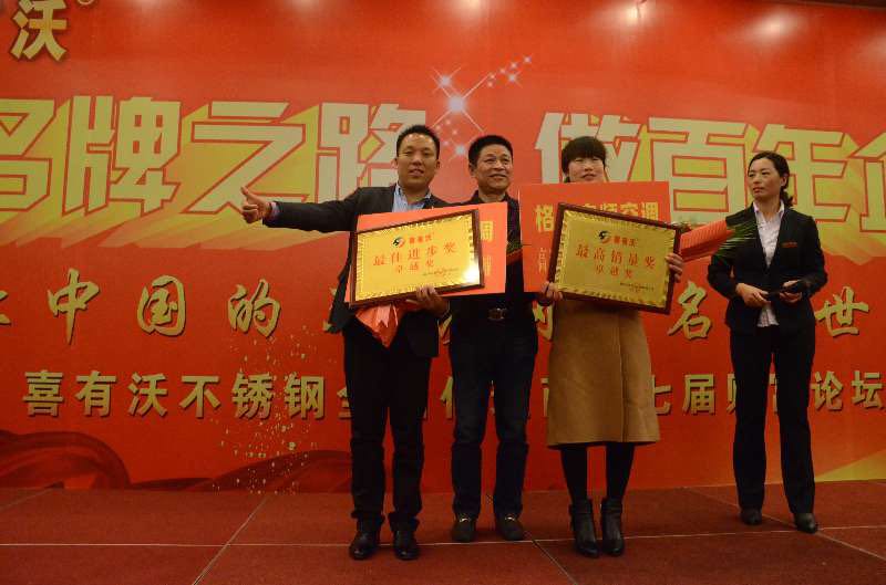 26日晚,喜有沃不锈钢颁奖晚会在萧山宾馆萧然厅举行。晚会气氛热烈、场面温馨。喜有沃员工们用精心编排、充满朝气、温暖情怀的舞蹈、魔术、歌曲、朗诵等节目为参加人员带来了欢声笑语;趣味十足的游戏让喜有沃代理商家人参与其中,脸上洋溢着欢乐的笑容,大家其乐融融。晚会上,喜有沃对获得2016年的“最美喜师傅奖、最高销量优秀奖、最佳进步优秀奖、最高销量绩优奖、最佳进步绩优奖、最高销量卓越奖、最佳进步卓越奖”等进行集中颁奖。其中,喜有沃不锈钢特别为我会、名高不锈钢、青山钢铁等颁发突出贡献奖,以表达其企业对相关单位的认可与感恩之情。