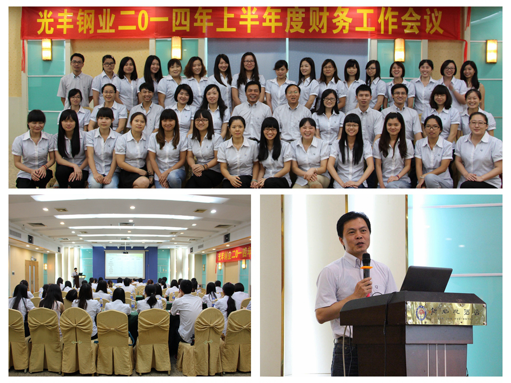 7月19日,光丰钢业在佛山市顺德区陈村镇新君悦酒店召开2014年上半年度财务工作会议。参加会议的有吴伟斌董事长,以及光丰旗下9家公司:佛山市光丰钢业有限公司、光丰(肇庆)钢业有限公司、无锡市光丰钢业有限公司、佛山市庆丰钢业有限公司、佛山市清华烽钢业有限公司、佛山市国丰钢业有限公司、佛山市顺祥丰贸易有限公司、佛山市宝捷物流有限公司、佛山市聚镭兴分条厂的财务工作人员。会上,各公司财务管理人员对本公司的经营情况做了分析,并提出了下半年的工作计划和工作重点。