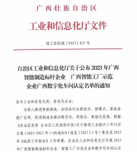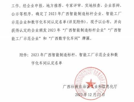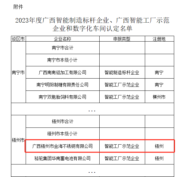 祝贺金海不锈钢荣获2023年广西智能工厂示范企业