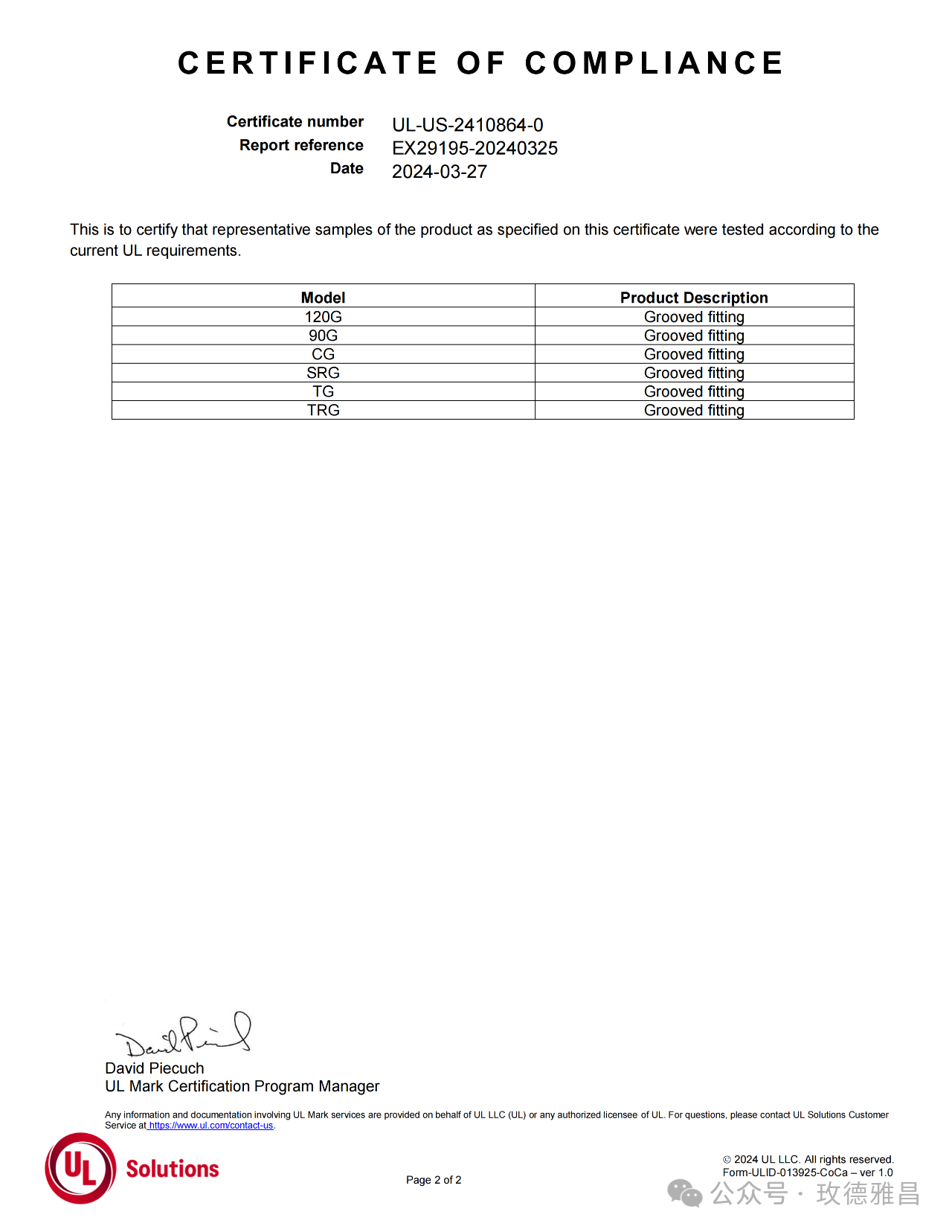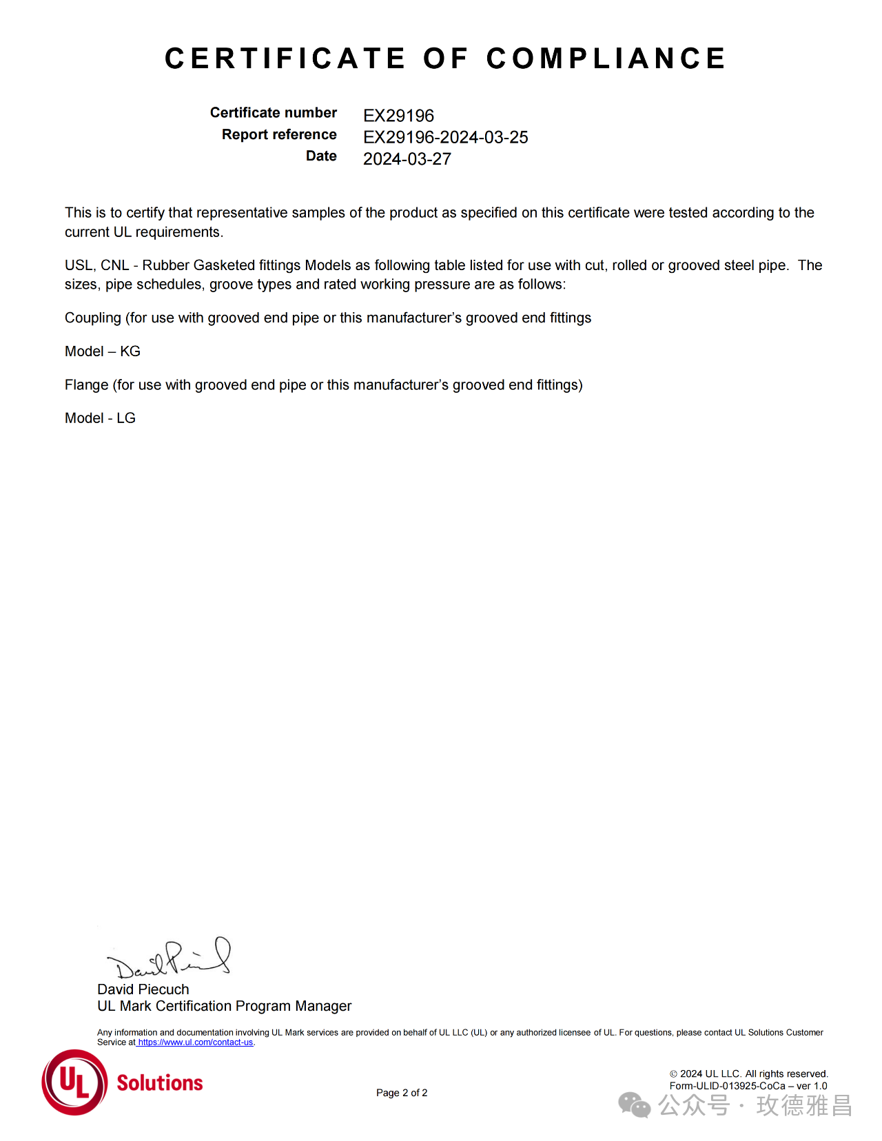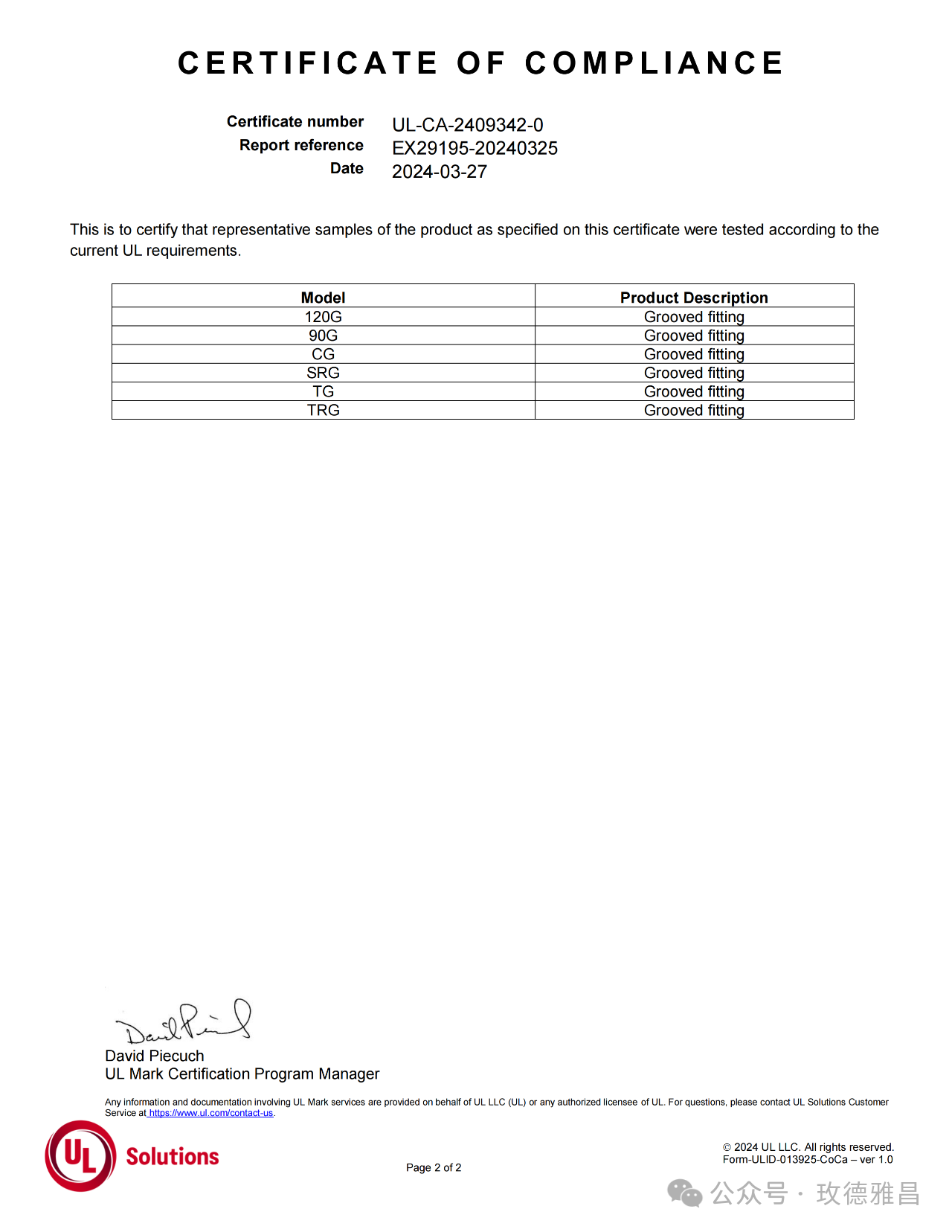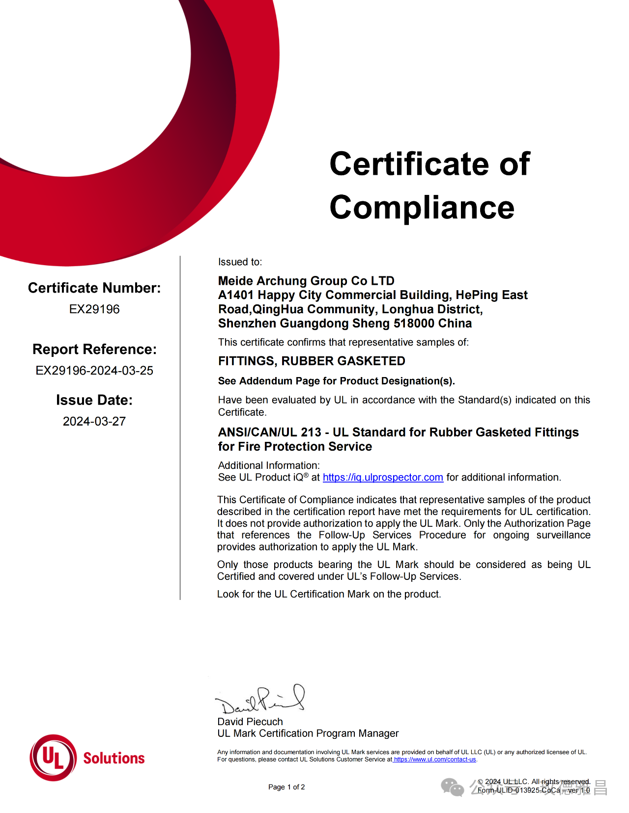 玫德雅昌不锈钢沟槽管件与管卡产品荣获UL标准认证