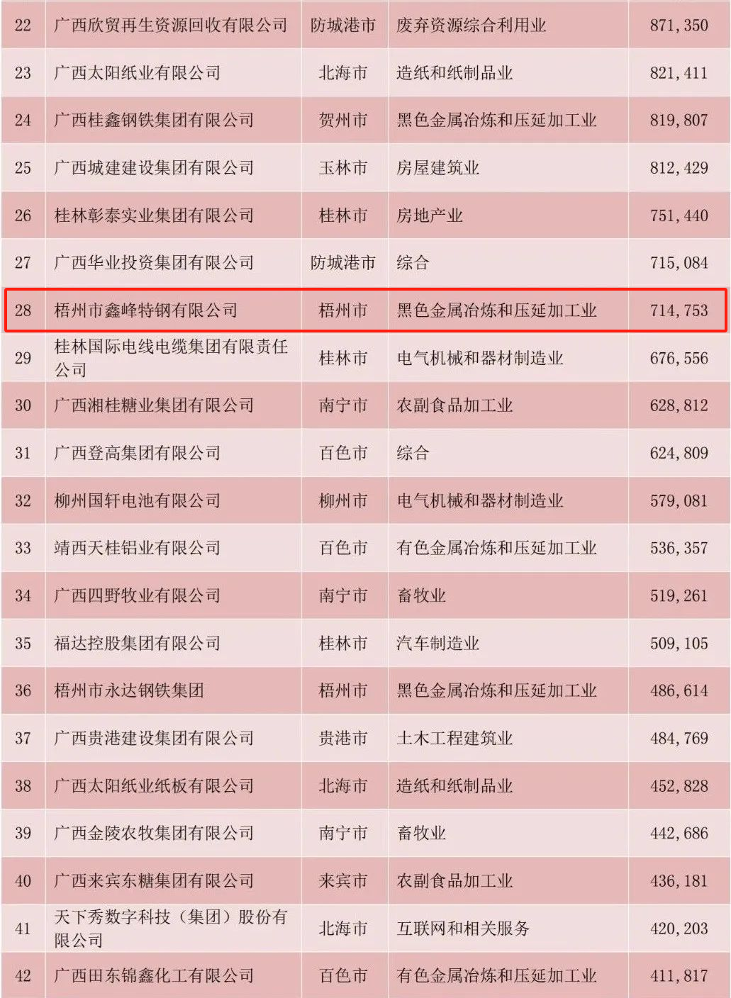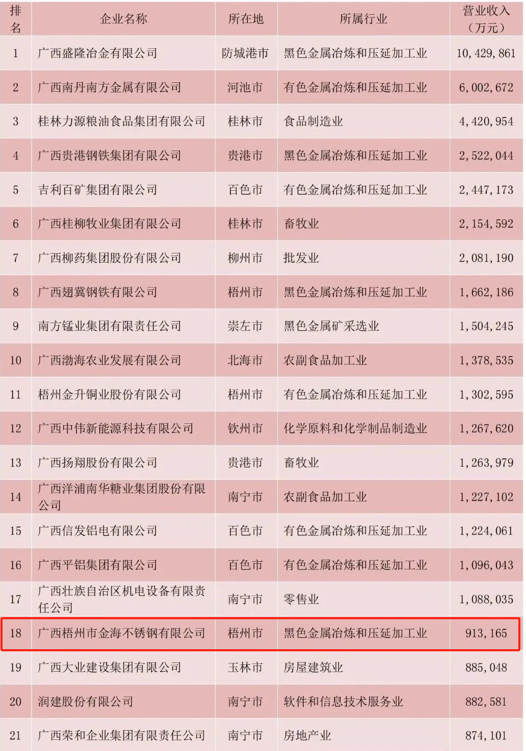 广东省不锈钢材料与制品协会副会长单位广东金海辉煌集团旗下核心企业梧州市金海不锈钢有限公司、副会长单位佛山鑫峰恒立母公司梧州市鑫峰特钢成功上榜,分别位居第18名和第28名。