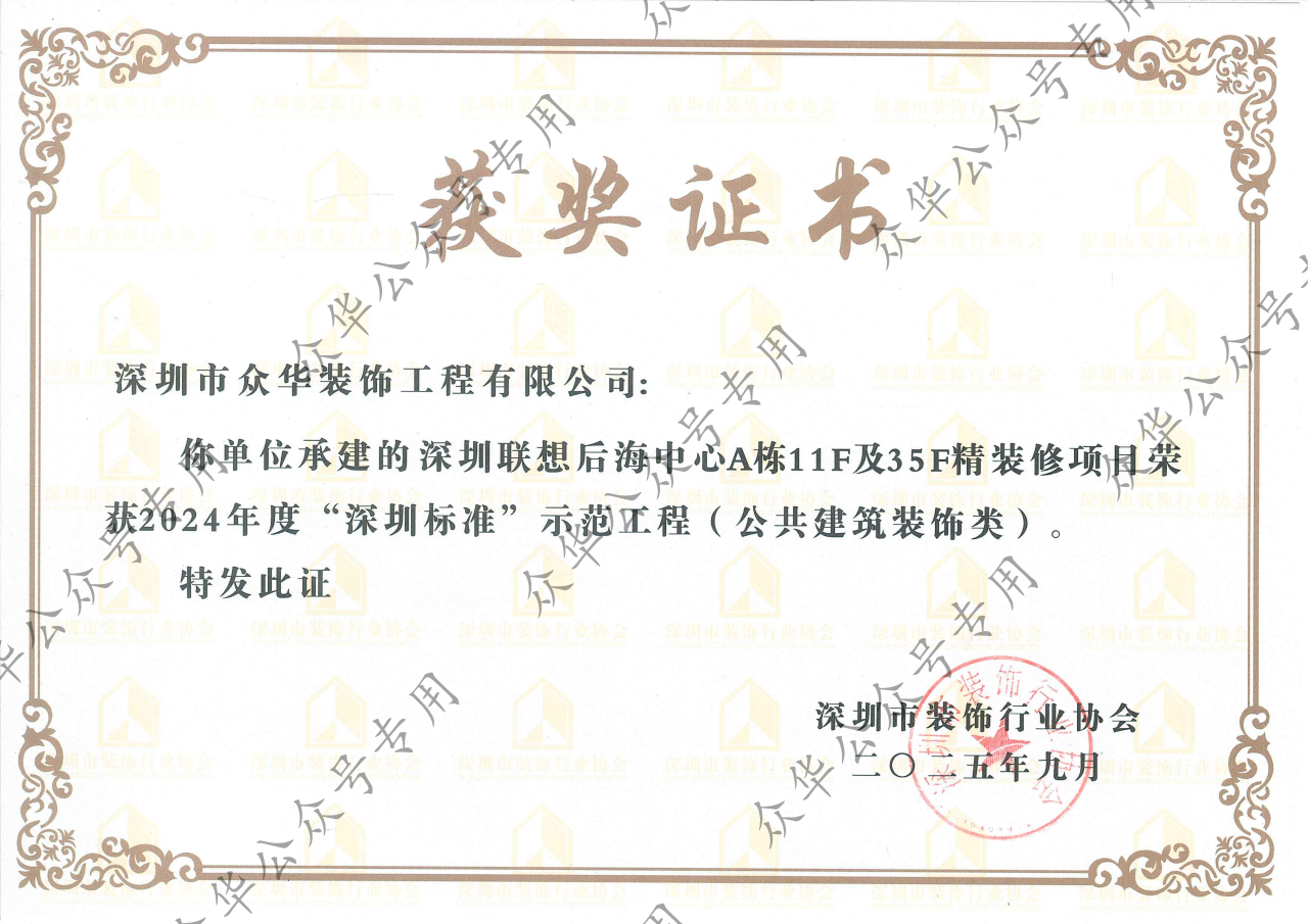 “深圳标准”示范工程评选旨在表彰在施工、质量、管理制度等各方面体现深圳品质、深圳品牌的标杆项目。此次获奖,是对众华始终坚持高标准、严要求的最佳印证。