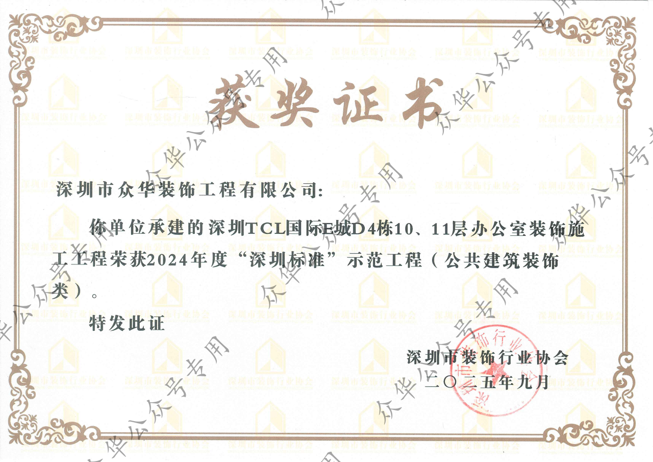 2024年度“深圳标准”示范工程评选结果正式揭晓,广东省不锈钢材料与制品协会会员单位深圳市众华装饰工程有限公司承建的深圳联想后海中心A栋11F及35F精装修项目和深圳TCL国际E城D4栋10、11层办公室装饰施工工程双双荣获此项殊荣,彰显了其在高端办公空间装饰领域的卓越实力。