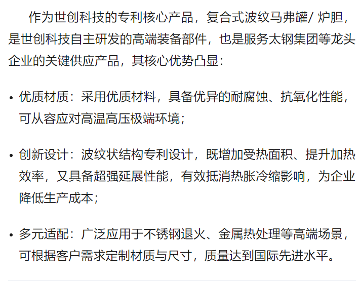 近三年来,在太钢南方公司的支持下,太钢310S耐热钢缩短交货期,保持质量稳定,世创科技客户对太钢310S制作的复合式波纹马弗罐/炉胆,需求量大幅提升。
