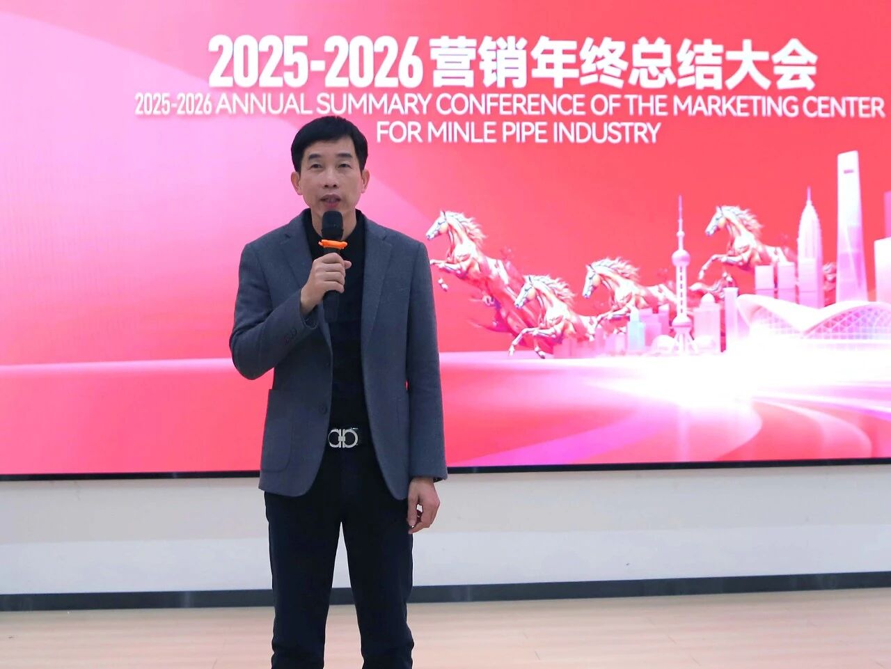 民乐管业董事长麦稳球先生致辞——对全国各地销售精英齐聚生产基地表示热烈欢迎,并强调销售以业绩为核心评价标准。面对市场下行、行业竞争加剧等挑战,提出 2026 年破局思路并明确方向,全体营销人员将以促成交为目标,突破传统思维,全力冲刺业绩。