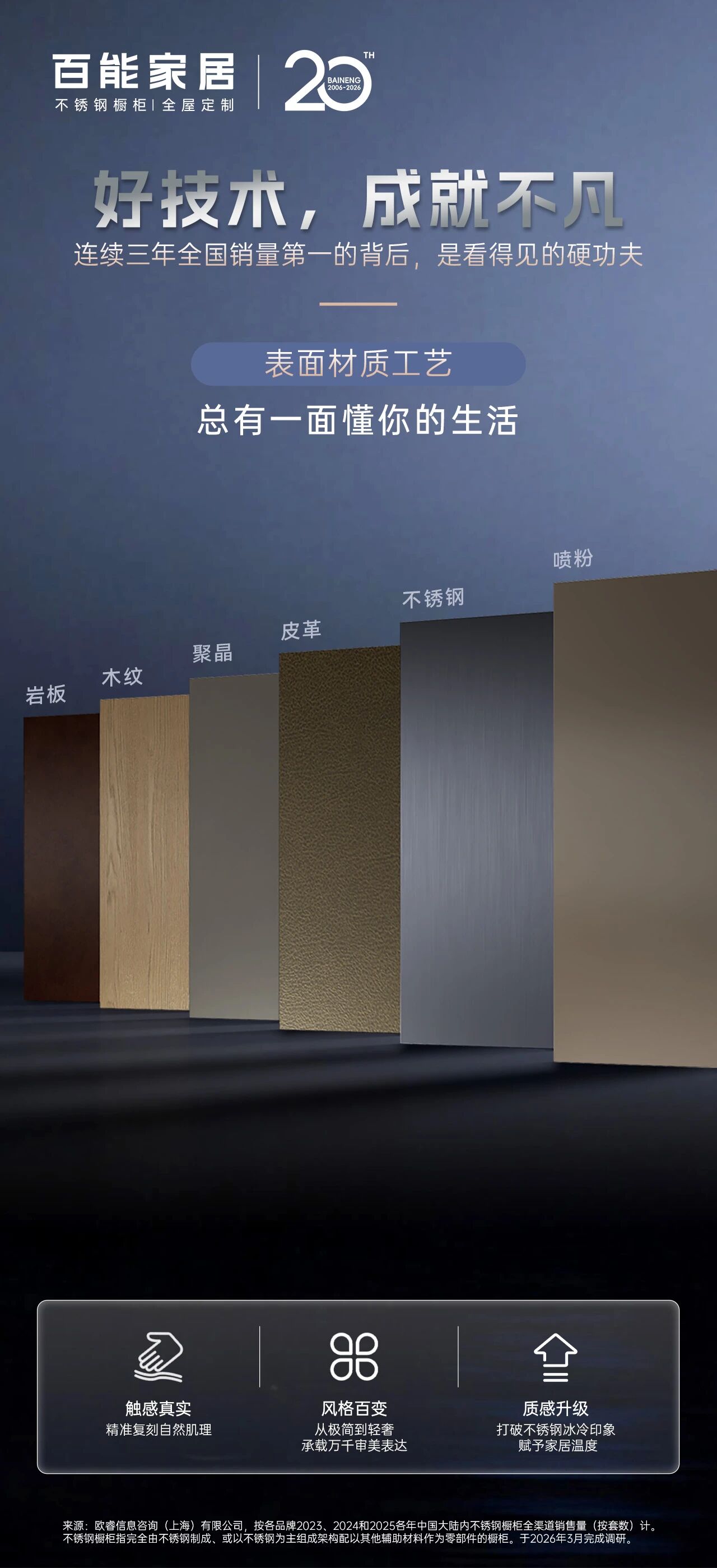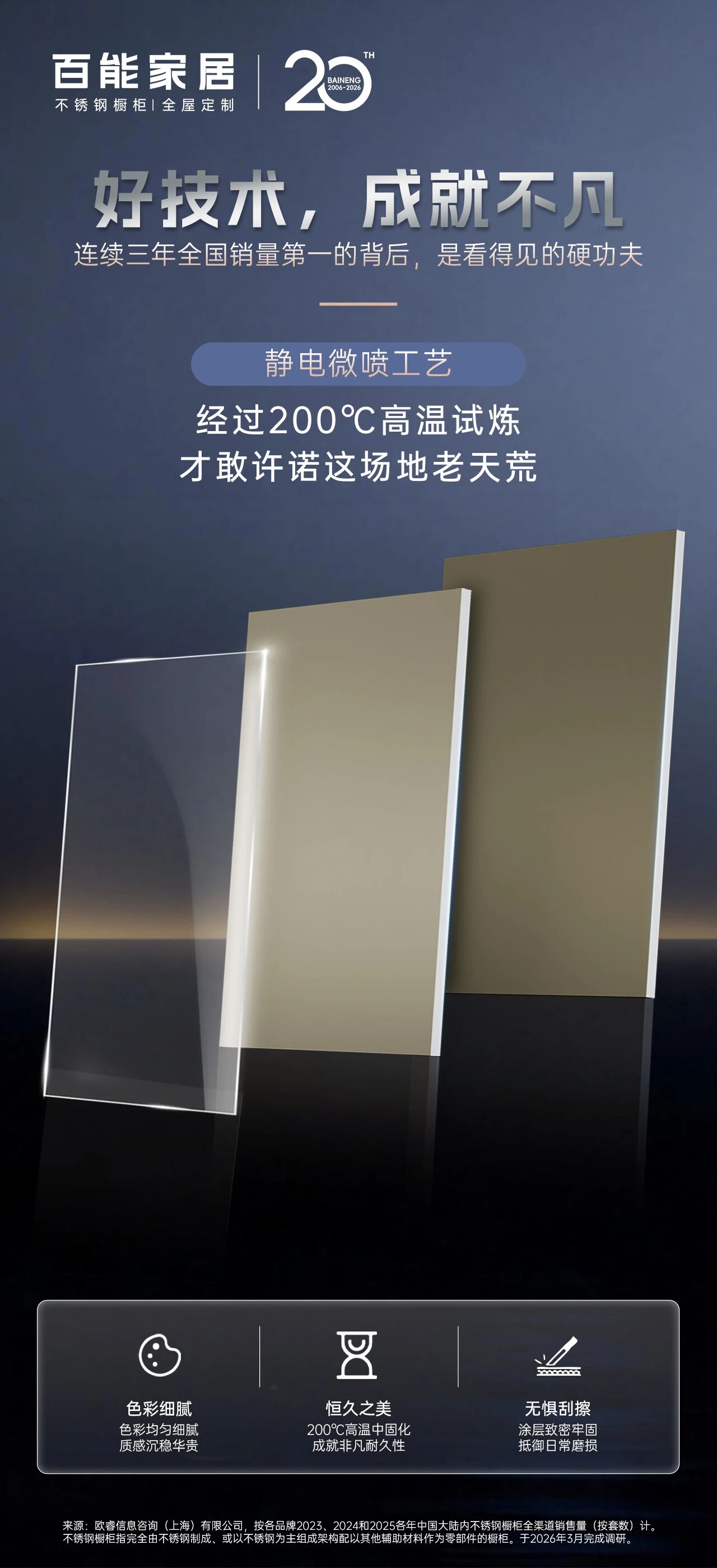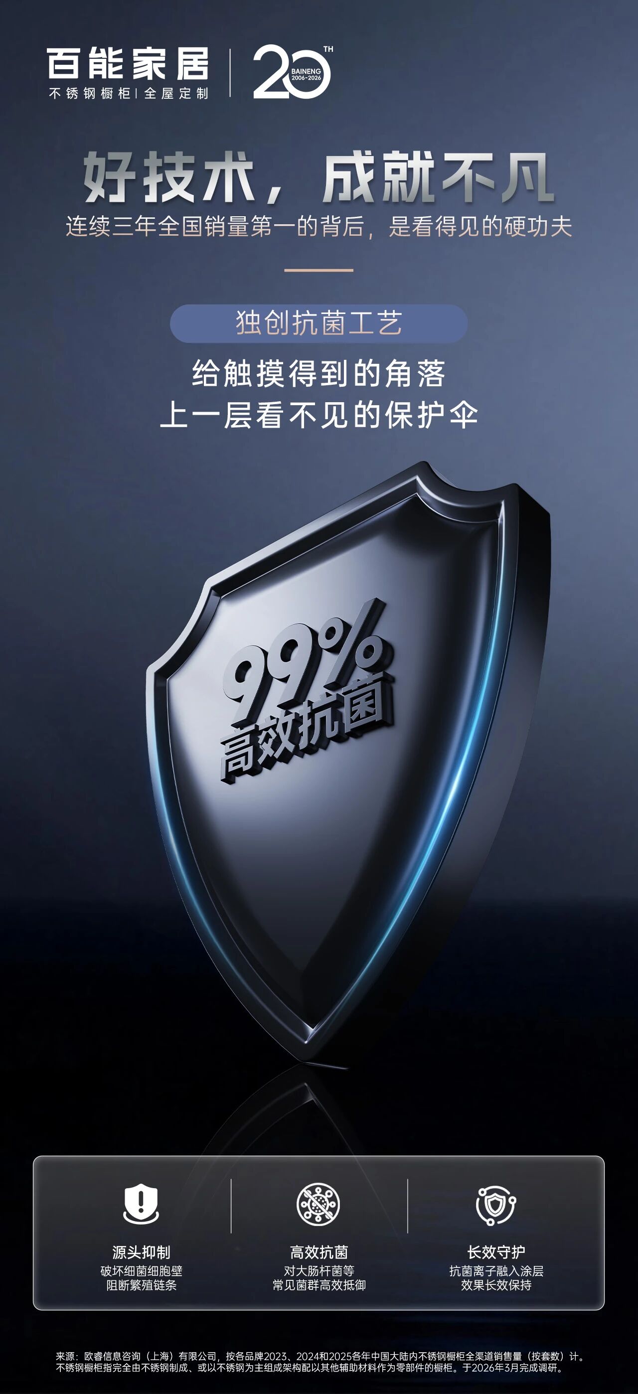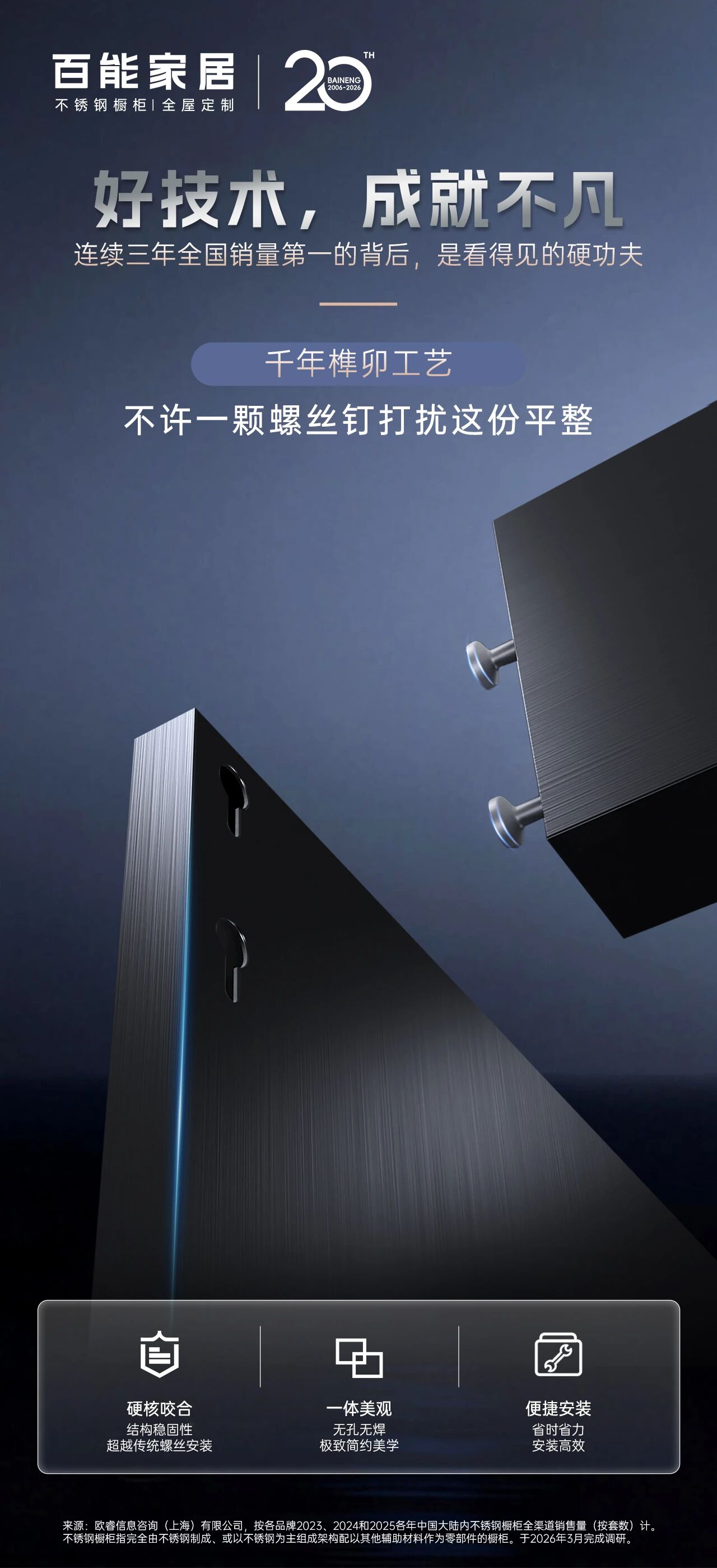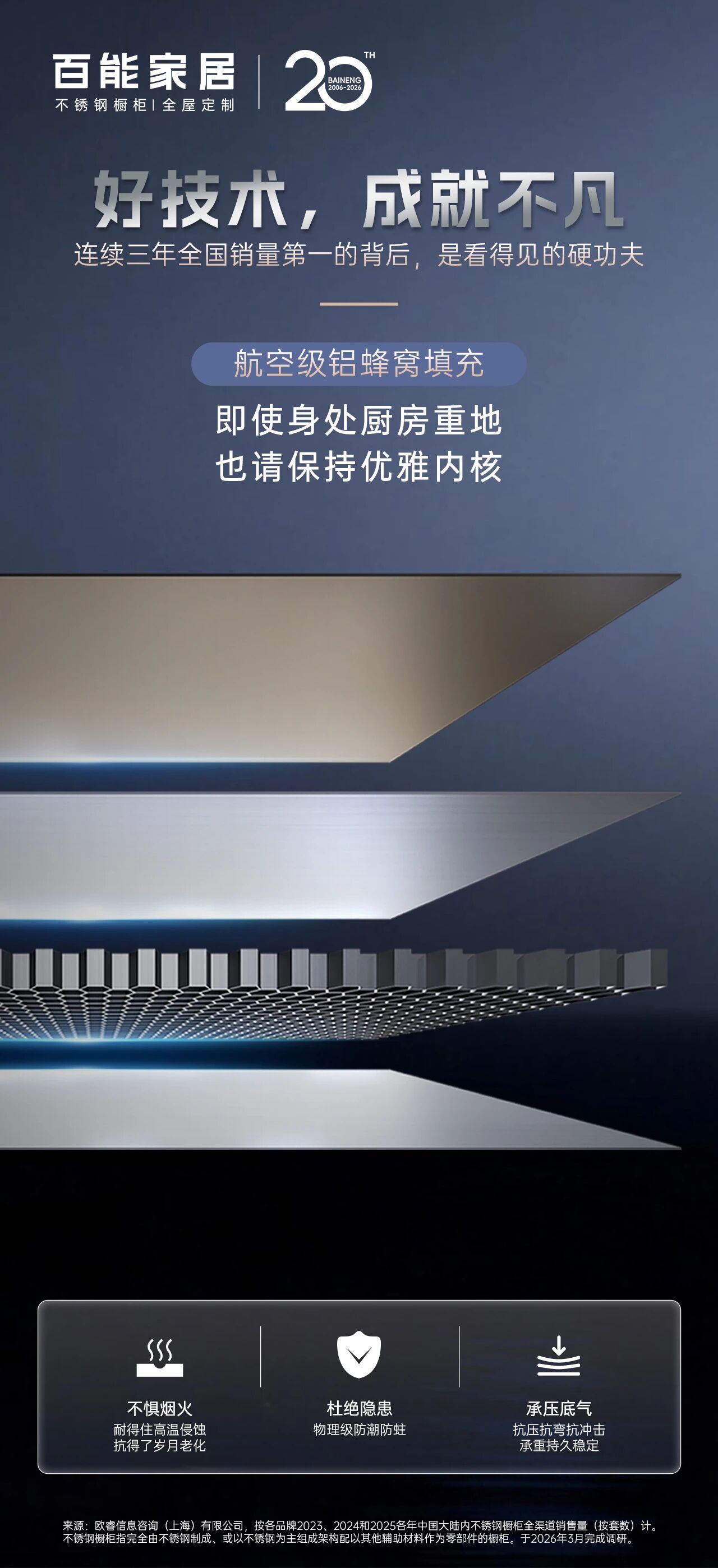 (销量第一* 数据来源:欧睿信息咨询(上海)有限公司,分别按2023、2024、2025年中国大陆内全渠道销售量(按套数计)。不锈钢橱柜指以不锈钢为材料制成的橱柜。于〈2026/03〉完成调研。)