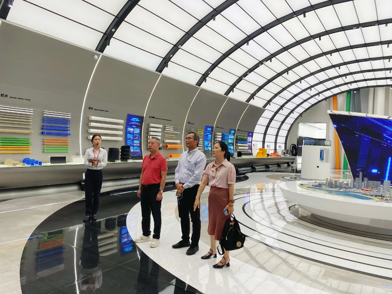 在黄卓兴总经理、销售总监周智辉的陪同下,林泽榆会长一行首先参观了联塑集团总部的联塑学院、研究院、检测中心和印象馆,并听取了企业的发展历程、市场业务分布等相关介绍。