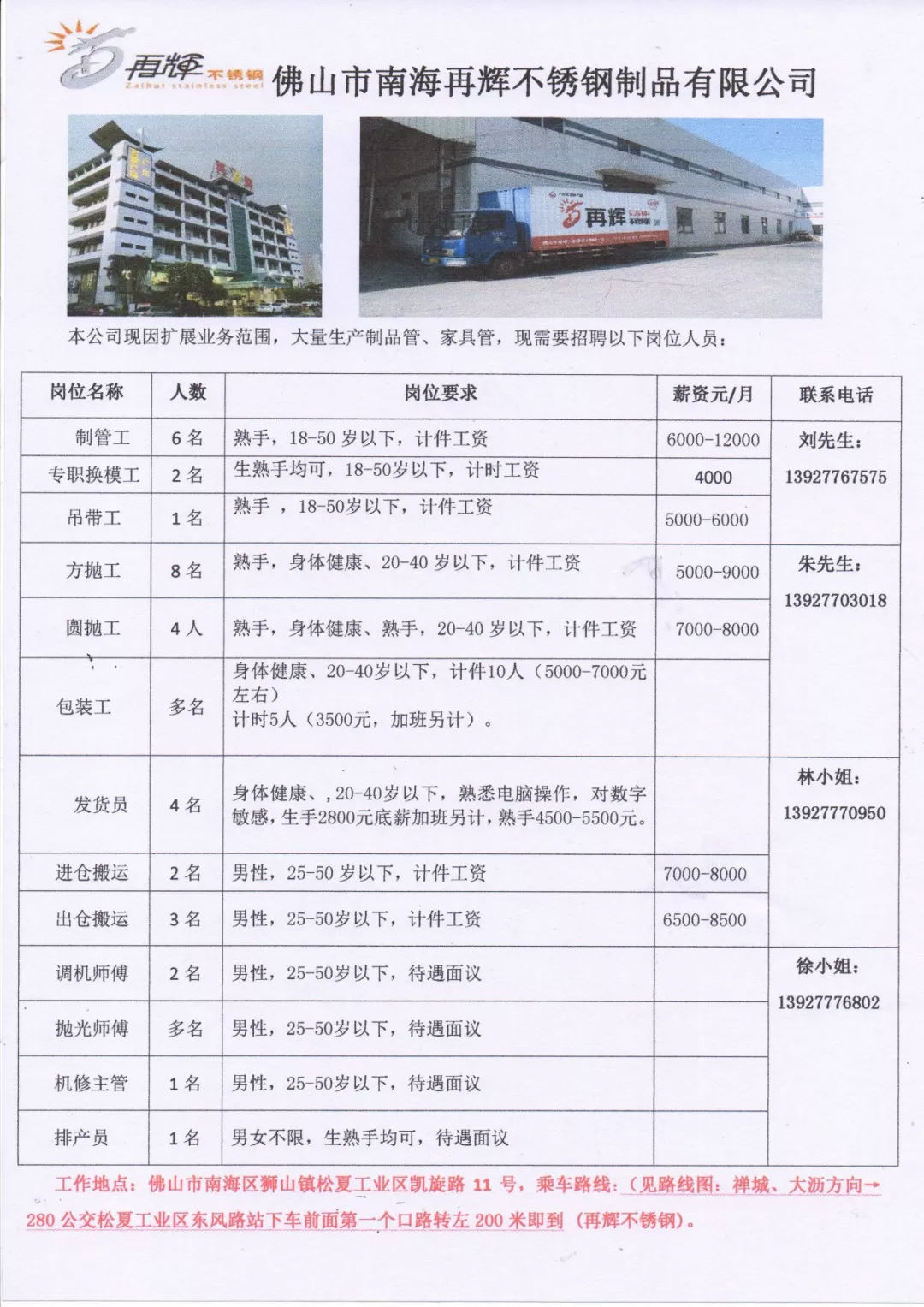 我会副会长单位——佛山市南海再辉不锈钢制品有限公司因业务发展需要,诚聘以下职位精英: