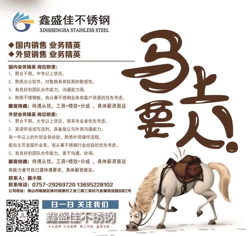 因业务发展需要,我会理事单位——佛山市鑫盛佳不锈钢有限公司诚聘以下职位精英: