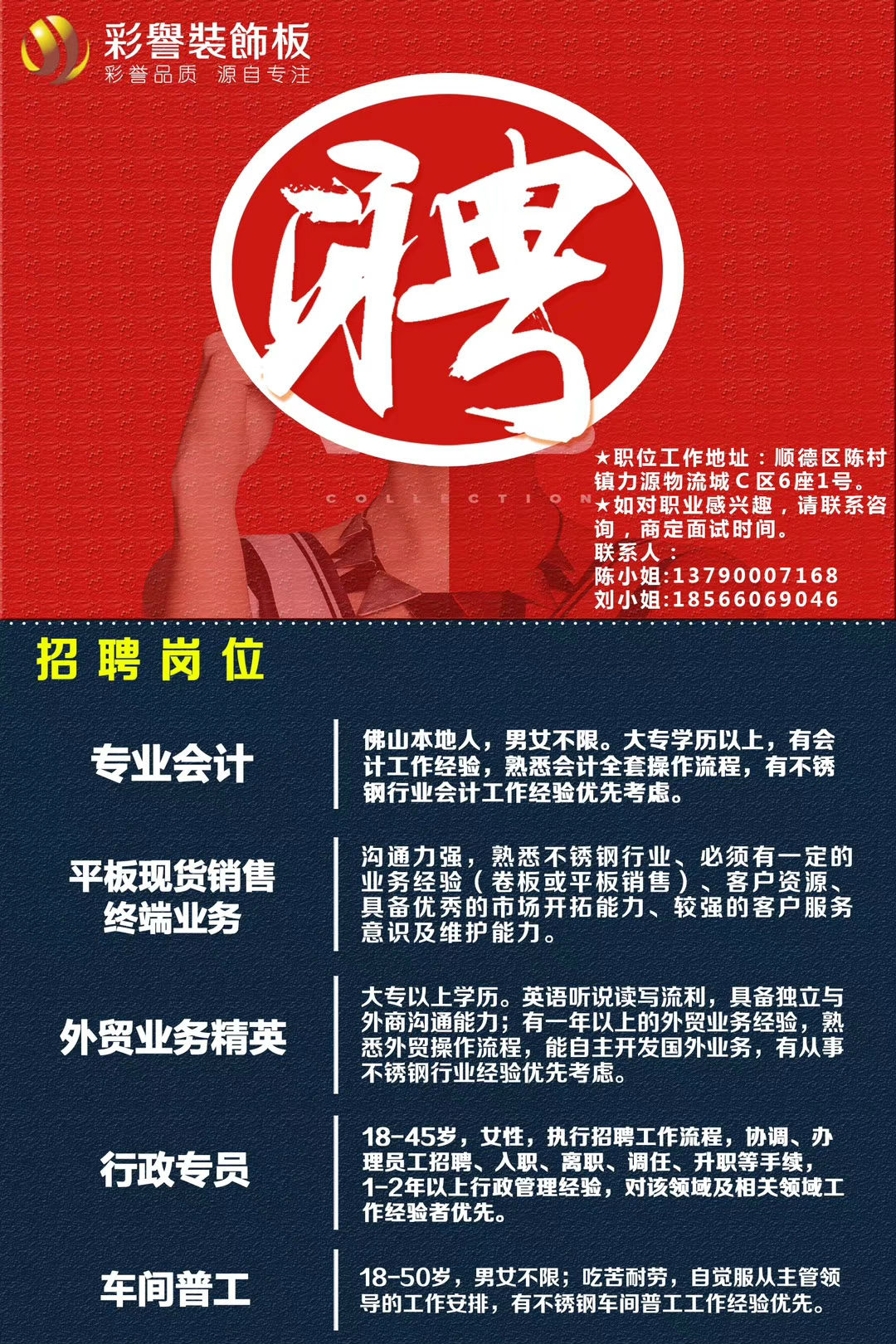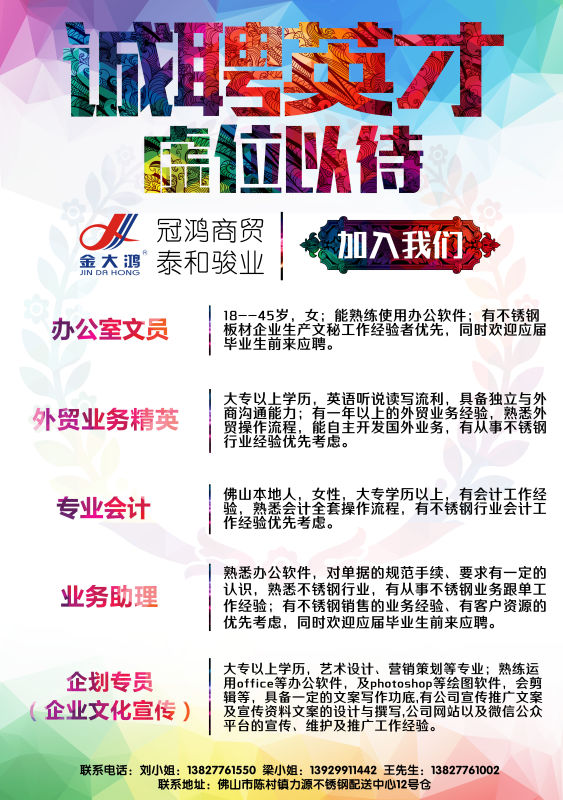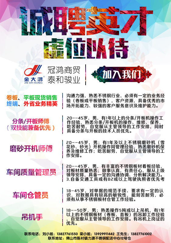 佛山市泰和骏业工贸有限公司是广东省不锈钢材料与制品协会副会长单位,该公司是一家集设计、定制、综合加工、销售、服务于一体的不锈钢品牌企业。该公司荣获“广东不锈钢装饰板十佳品牌”等荣誉称号,并成为正在推进的《装饰用不锈钢板》标准起草单位之一。现因业务发展需要诚聘以下精英: