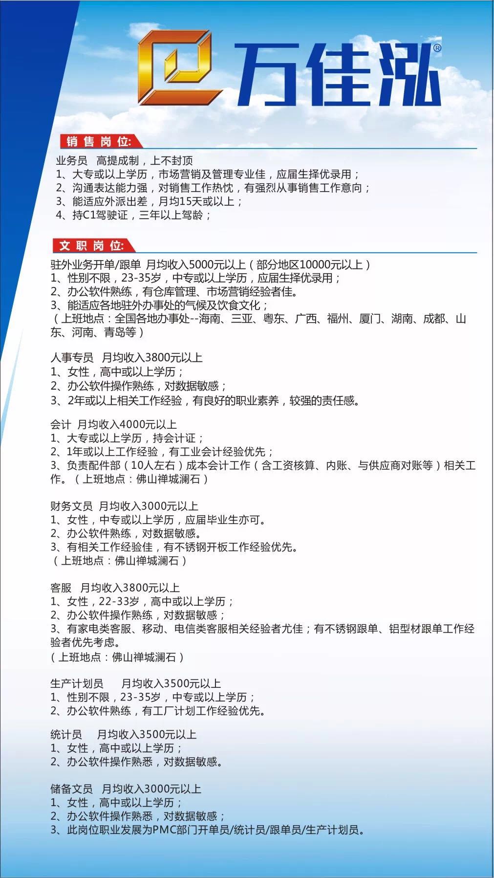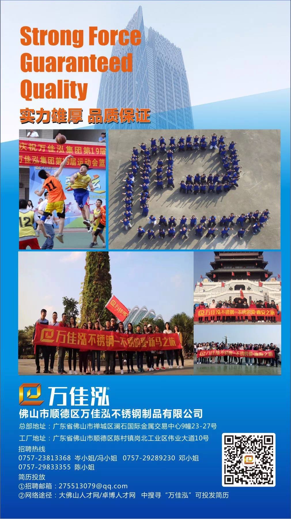 佛山市顺德区万佳泓不锈钢制品有限公司系广东省不锈钢材料与制品协会常务理事单位,是我会《装饰用不锈钢焊管》团体标准以及正在推进的《装饰用不锈钢板》地方标准起草单位之一,多次荣获“广东不锈钢制管十佳品牌”、“广东不锈钢装饰板十佳品牌”等荣誉称号。现因业务发展诚聘以下精英:
