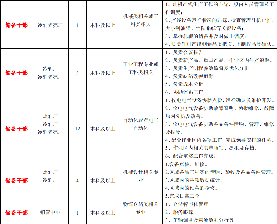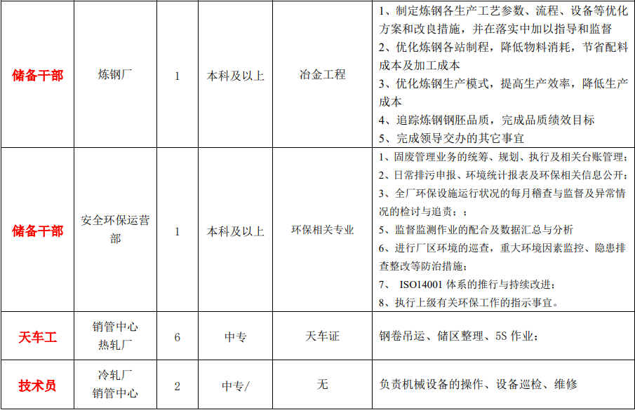 鞍钢联众(广州)不锈钢有限公司是广东省不锈钢材料与制品协会会员单位,现因发展需要诚聘精英加盟。 鞍钢联众(广州)不锈钢有限公司是炼钢、热轧、冷轧一贯作业的专业不锈钢生产基地,其前身 为台湾义联集团旗下联众(广州)不锈钢有限公司,于 2001 年 12 月 30 日成立。2014 年 10 月鞍钢 集团以增资扩股方式认购并持有联众(广州)不锈钢有限公司 60%股权,重组成鞍钢联众(广州)不 锈钢有限公司。鞍钢集团与义联集团的合作开创了海峡两岸钢铁企业合作新纪元,双方相互支持、密 切配合,共同将鞍钢联众(广州)不锈钢有限公司打造成世界不锈钢龙头企业。 1.工时与休假:正常班:五天八小时;轮班:三班两倒,上四天休两天,每天十二小时。超出法定 标准工作时间部分依法支付加班费,享有带薪年休假、婚假、产假、哺乳假、丧假、私休假、病假等 假期。 2.社保及公积金:为全体员工购买养老、工伤、失业、生育、医疗五项社会保险及住房公积金。 3.商业保险:为员工参加综合医疗(含门诊和住院)、意外伤残、疾病死亡、重大疾病等险种;为员工 近亲属参加意外伤残及意外医疗险。 4.工作补助:食宿交通:提供住宿、提供市区至公司之上下班交通车,提供工作日免费午餐(实习生 住宿免费)。 5. 培训发展:重视人才培养,对储备干部进行六个月轮岗锻炼,双向选择合适岗位;培训体系完善, 分为内部训练、派外训练,参训机会良多。 6.年度效益奖金:根据公司运营状况及个人实际表现,每年 12 月末发放。 7.调薪:常态调薪机制包括试用期满调薪、晋升调薪、年度调薪等。 8.综合工资:储备干部:7K-9K,轮班操作员/机修员:6K-8K,具体视岗位决定。 1.联系人:张先生 2.电话:020-22208128 3.地址:广州市黄埔区东区联广路 1 号 4.招聘邮箱:[email protected] |