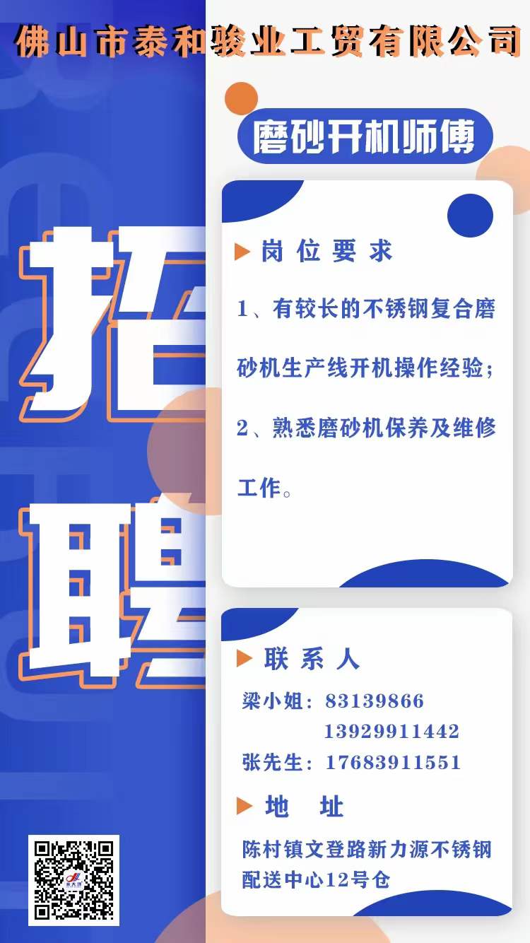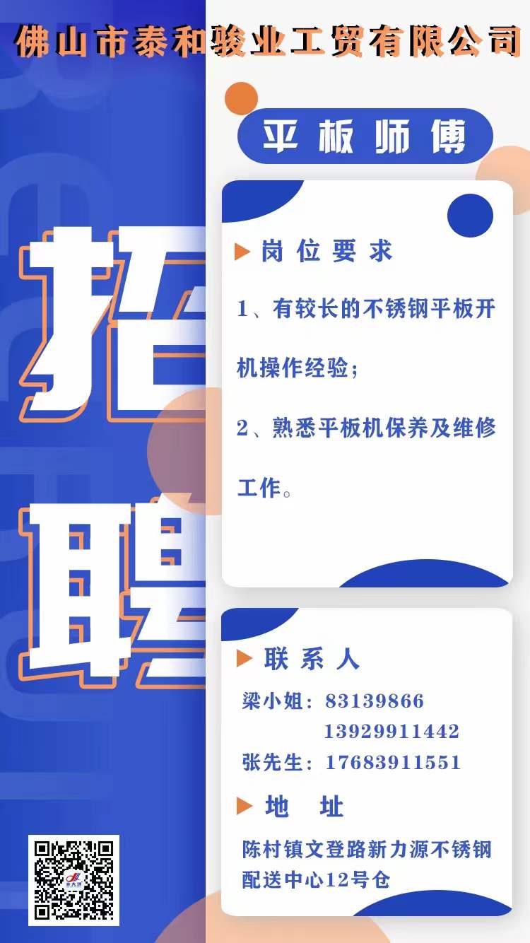 | 佛山市泰和骏业工贸有限公司(金大鸿装饰板)系广东省不锈钢材料与制品协会副会长单位,现因发展需要诚聘以下职位精英: | |