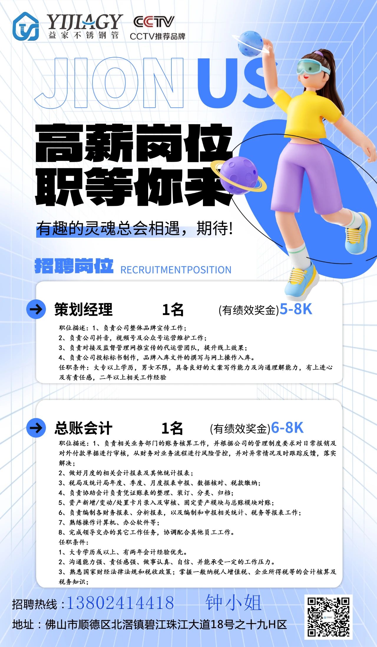广东益家管业有限公司是广东省不锈钢材料与制品协会理事单位,该公司是一家专业生产各种不锈钢管及管件的标准化企业,并被评为佛山市“专精特新”企业。其不锈钢管广泛用于市政工程、星级酒店、大型楼盘、别墅装修、医院、学校、家庭、燃气等工程,目前已成为深圳市光明水务、深圳市福田水务、佛山水务、湖南株洲水务、贵州双水水务、湖北麻城水务、深圳粤达水务工程公司等优质供应商。公司主要经营各类不锈钢水管及燃气管及不锈钢双卡压式、焊接式、沟槽式、快捷式、环压式管件及其它金属制品。现因发展需要诚聘以下职位精英:
