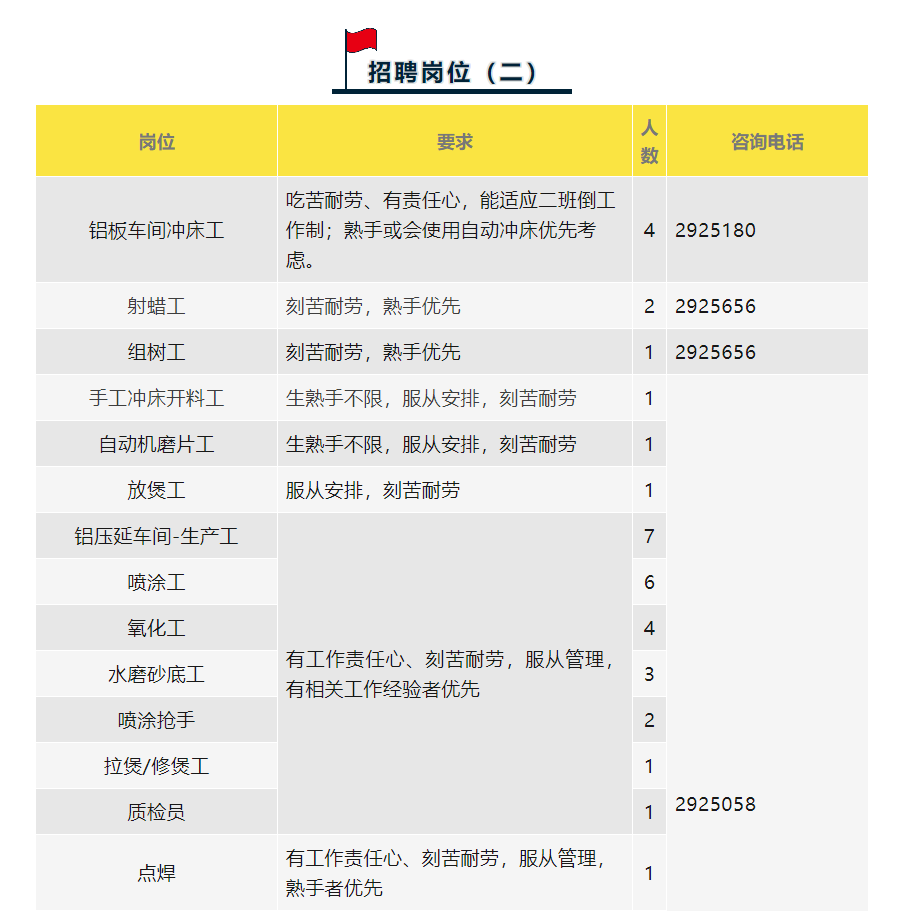 15、人力资源经理 ◆ ◆ 岗位职责 根据集团公司战略发展规划,制订集团公司人力资源发展战略规划,为实现集团发展战略目标提供人力支持,并落实执行。 ◆ ◆ 招聘要求 8年以上人力资源管理经验,具有大型制造业(规模不小于1000人)行业经验优先考虑。 联系我们 总部地址:云浮市新兴县新城镇大南路南段48-50号 广州地址:广州市天河区黄埔大道西76号富力盈隆广场901室 简历投递: 联系电话: 0766-2925577/18127195930(微信同号) |