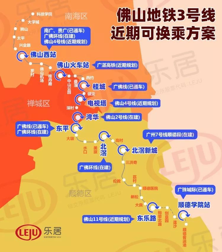 佛山地铁3号线通车后,短期内至少可换乘5条轨道,包括广佛线(已通车)、佛山2号线(在建)、广州地铁7号线顺德段(在建)等3条地铁以及广佛环线城际(在建)、广珠城际(已通车),其中多条轨道可以直通广州,湾华站为佛山2、3号线换乘站。
