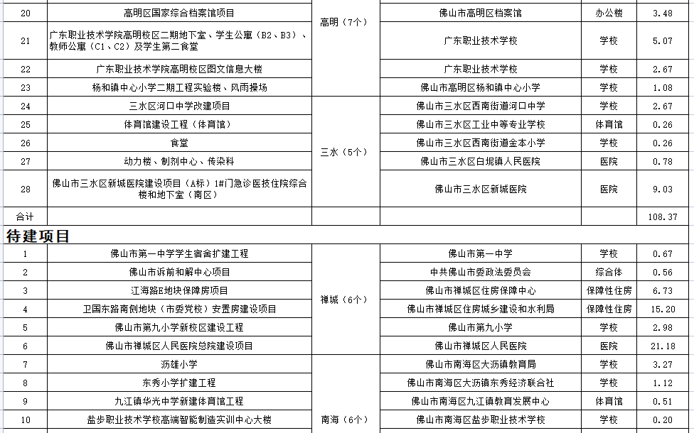 第一批试点项目共56个,其中国有资金参与项目54个(禅城区11个,南海区16个,顺德区6个,高明区10个,三水区11个);社会投资项目2个(禅城区、高明区各1个)。试点项目建筑面积共约248万平方米,总投资额约162亿元。