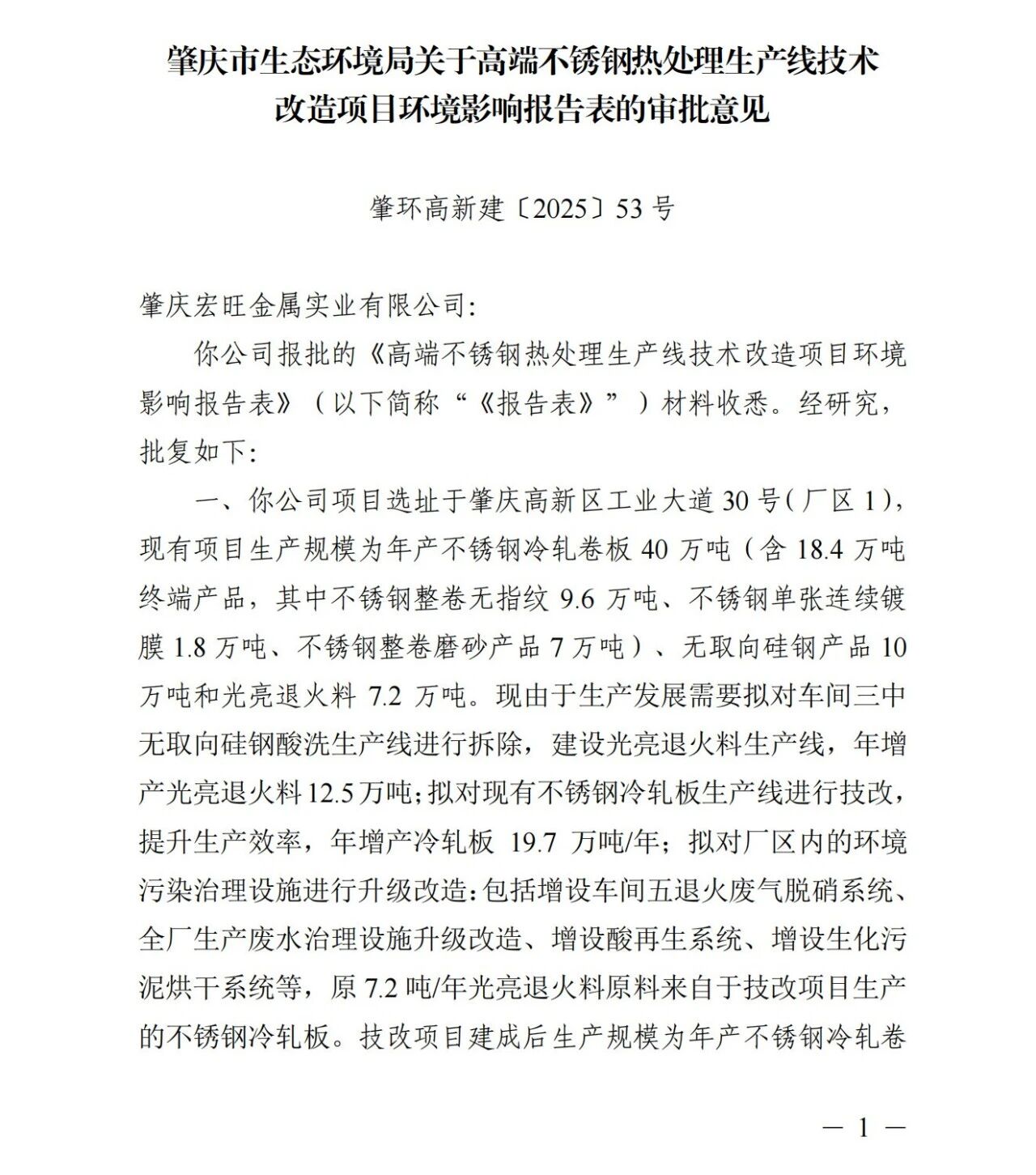 投资5000万!肇庆宏旺不锈钢技改项目获批
