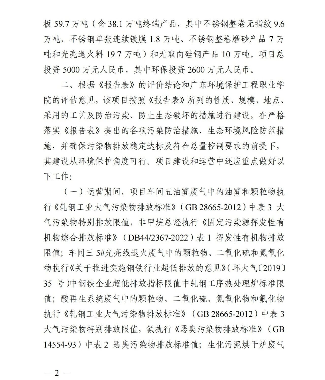 技改项目建成后生产规模为年产不锈钢冷轧卷板59.7万吨(含38.1万吨终端产品,其中不锈钢整卷无指纹9.6万吨、不锈钢单张连续镀膜1.8万吨、不锈钢整卷磨砂产品7万吨和光亮退火料19.7万吨)和无取向硅钢产品10万吨。项目总投资5000万元人民币,其中环保投资2600万元人民币。