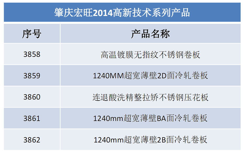 根据广东省高新技术企业协会《粤高企协〔2014〕40号》文件的精神,经专家评审等程序,2014年广东省高新技术产品认定评审工作已完成。肇庆宏旺金属实业有限公司生产的“1240MM超宽薄壁2D面冷轧卷板”等5项产品认定为广东省高新技术产品。