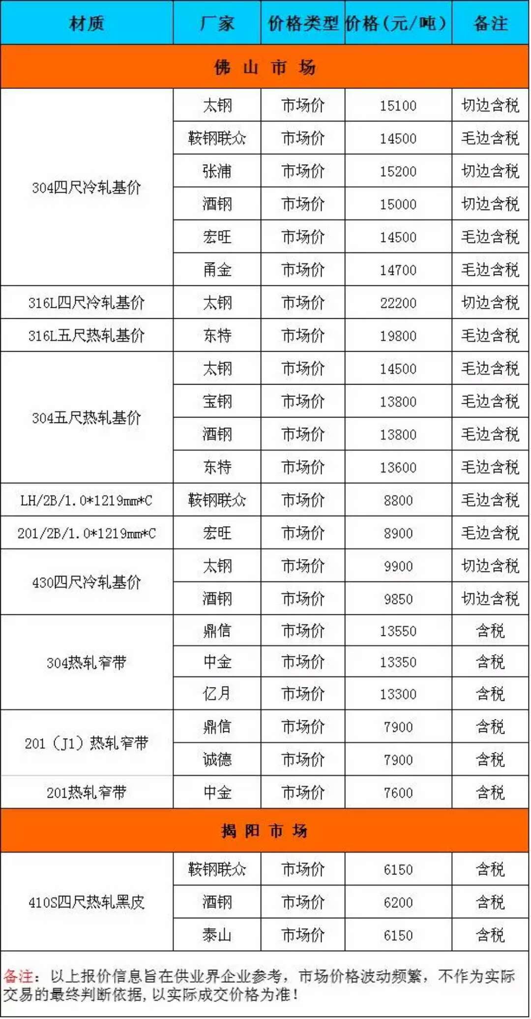 【广东不锈钢网】广东不锈钢市场主流参考报价
