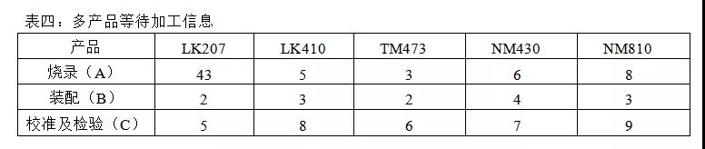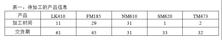 以上这些方法主要运用于多个产品在单台设备上的排序问题(适合于主生产计划排产),即每次只加工一种产品,这种方法可以借鉴到具体某个工序上的排产安排,其不能缩短加工时间,但可以调整延期分布情况。下面举例说明: