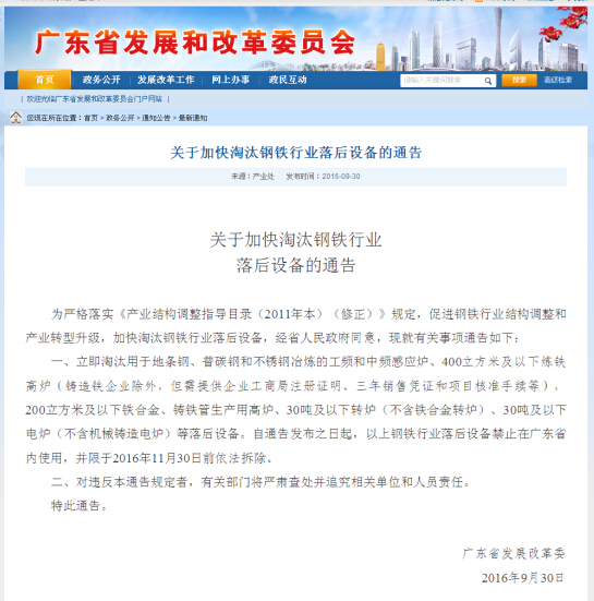 通告强调,自通告发布之日起,以上钢铁行业落后设备禁止在广东省内使用,并限于2016年11月30日前依法拆除。
