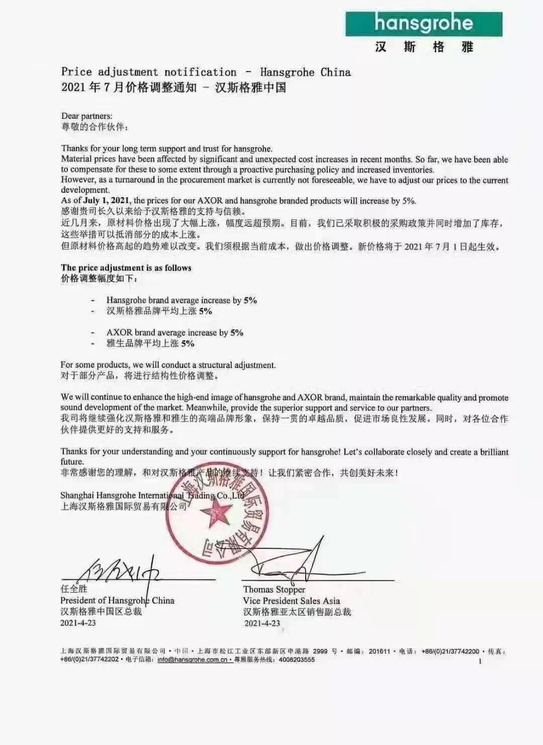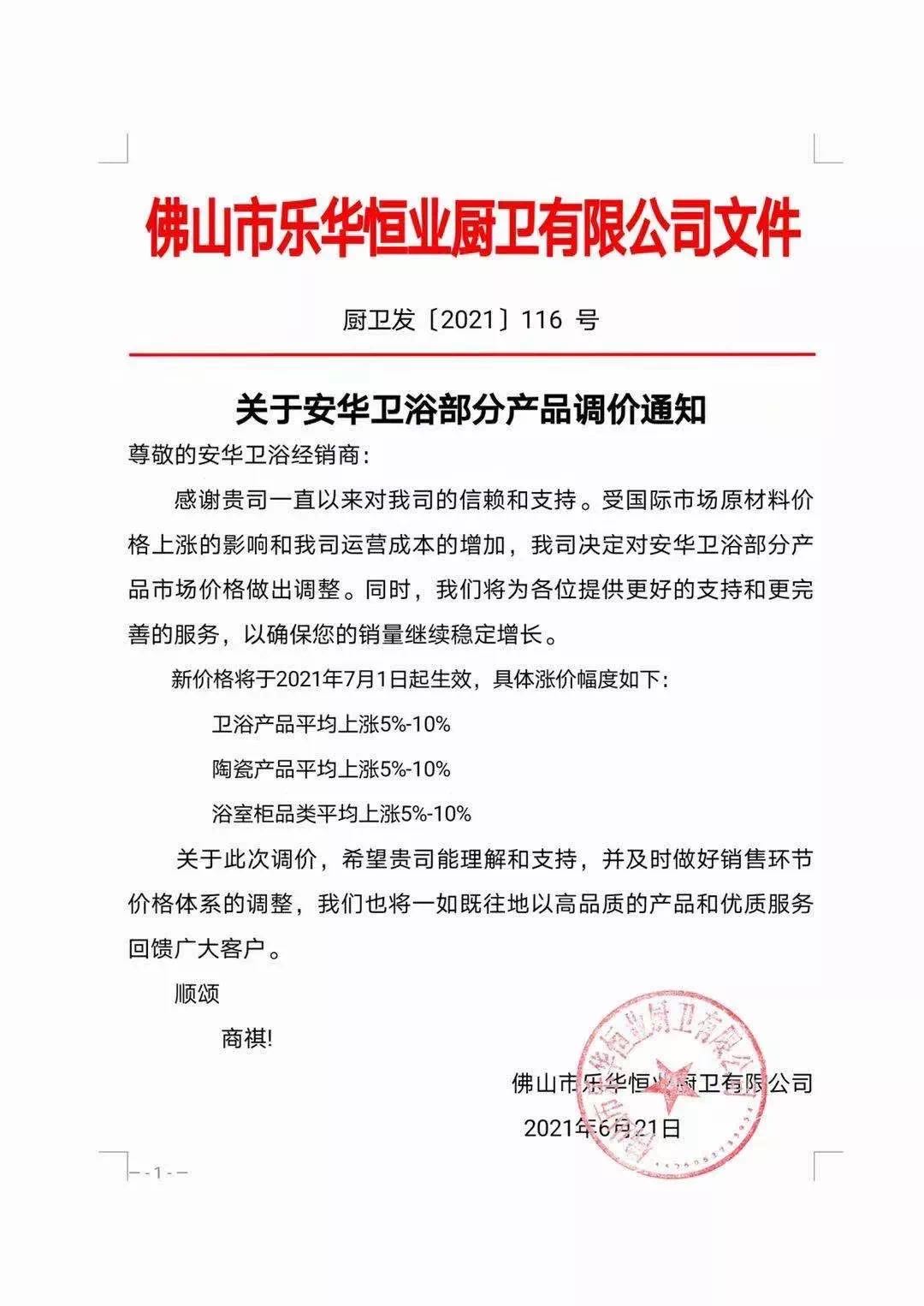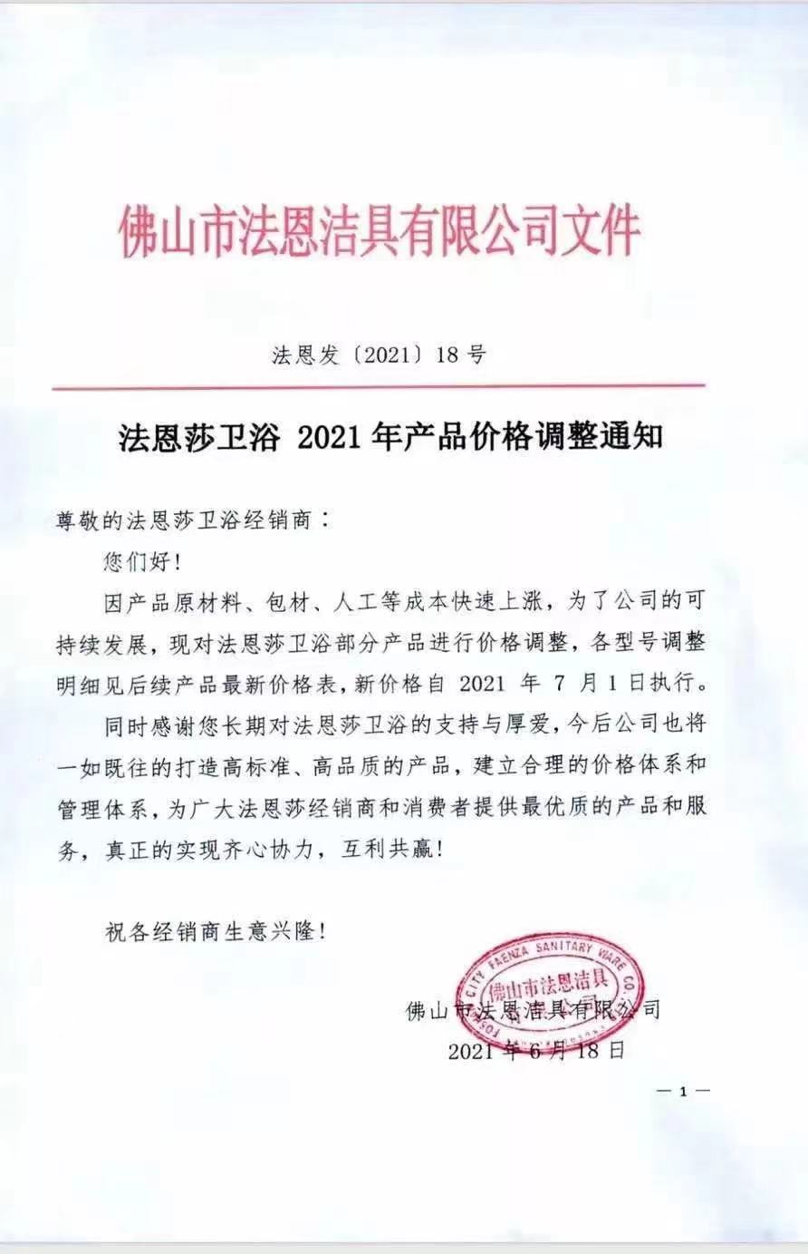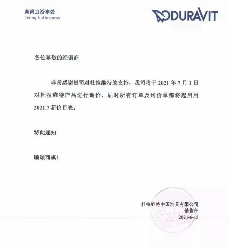 近日,成霖、汉斯格雅、法恩莎、安华、杜拉维特等大牌卫浴知名企业发布涨价通知,涨价幅度5%~10%左右。