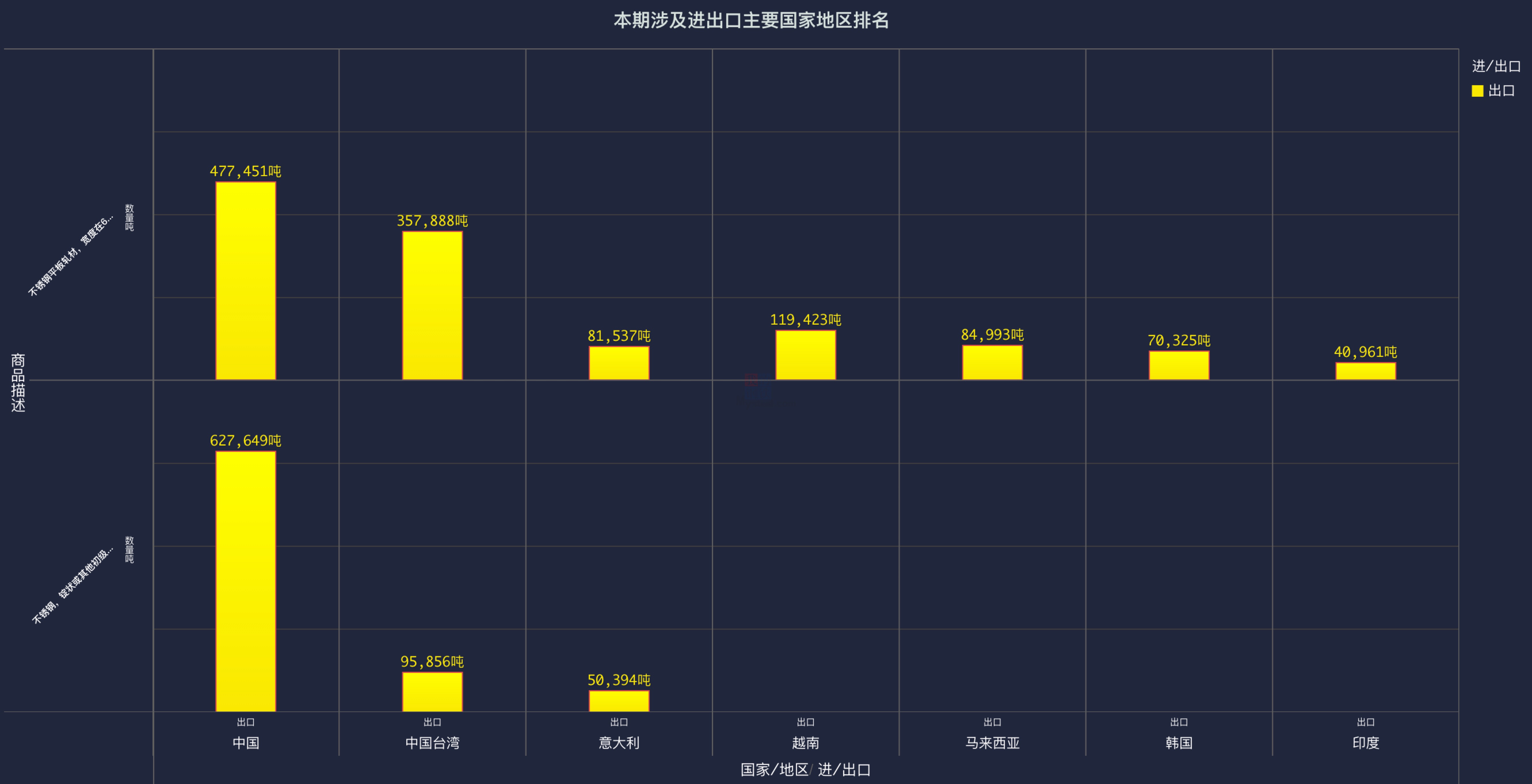 上半年不锈钢产品到达中国总量为1,222,168吨,其中卷板477,451吨,钢坯627,649吨。