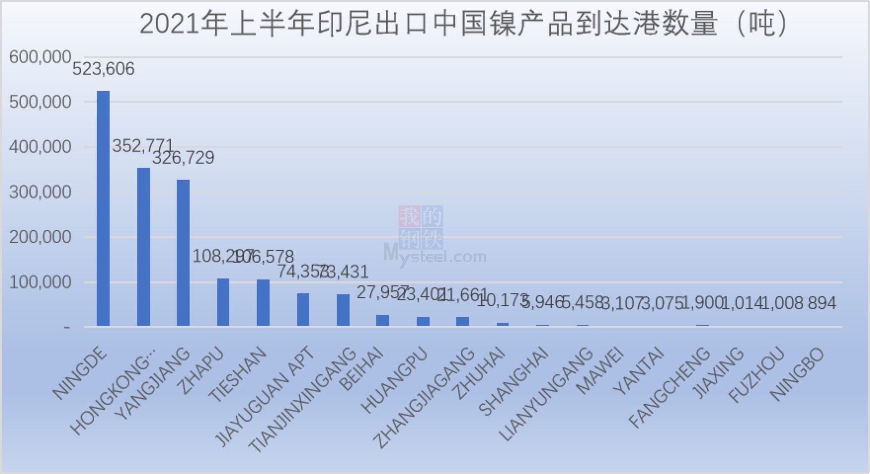 印尼上半年镍产品主要到达中国宁德、香港、阳江、乍浦、铁山、天津新港等港口。