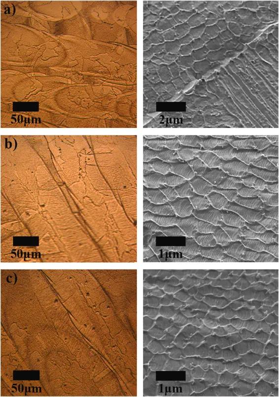 L-PBF 316L蚀刻表面的光学(左)和扫描电子(右)显微照片,作为打印速度的函数:(a)550(b)650(c)700 毫米/秒。