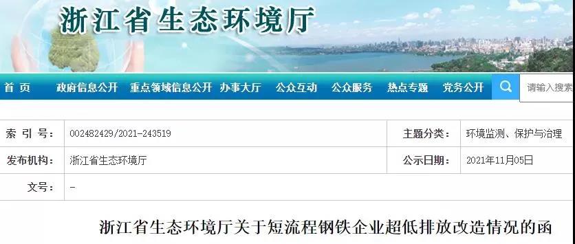 11月10日,浙江省生态环境厅官网发布了《浙江省生态环境厅关于短流程钢铁企业超低排放改造情况的函》。文件显示,浙江省在产的短流程钢铁企业均已在实施超低排放改造,并开展超低排放评估监测。然而,截至2021年9月30日,浙江省在产的短流程钢铁企业在“有组织排放、无组织排放、清洁方式运输”方面均未达到超低排放。