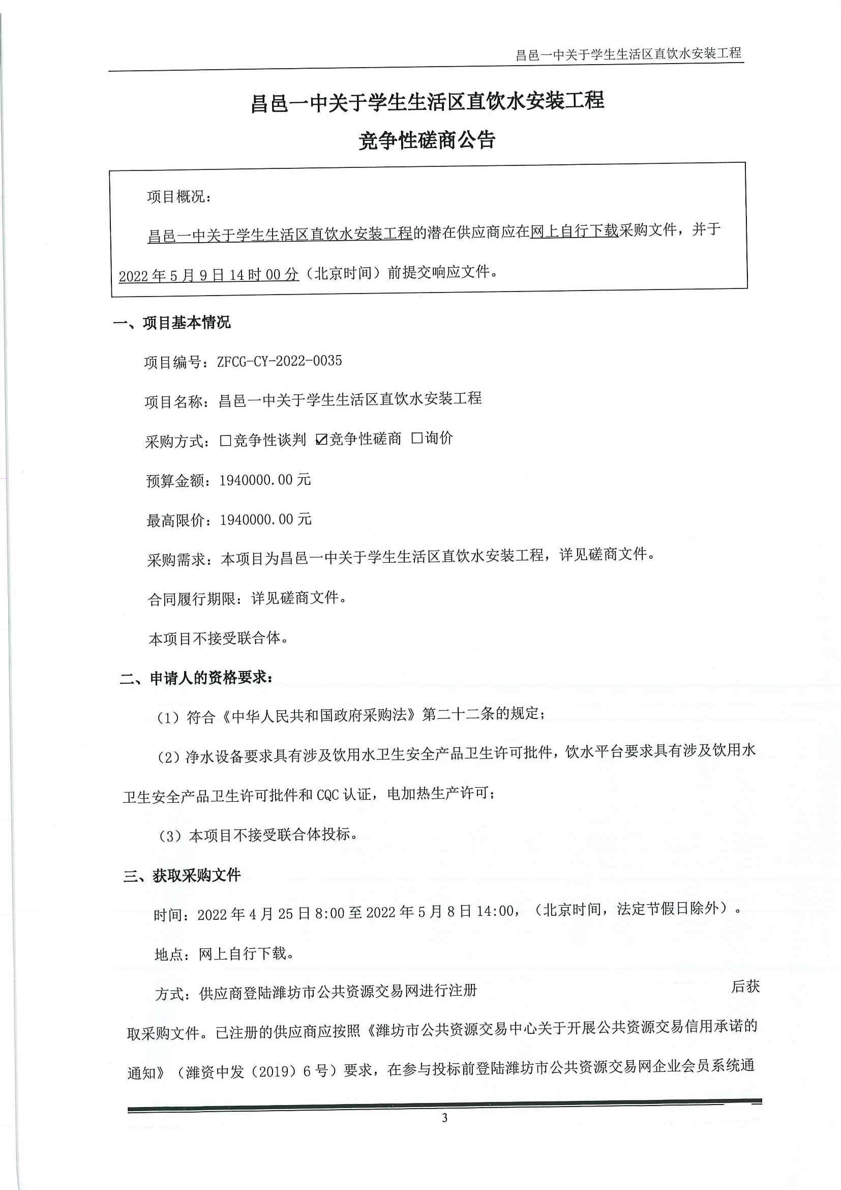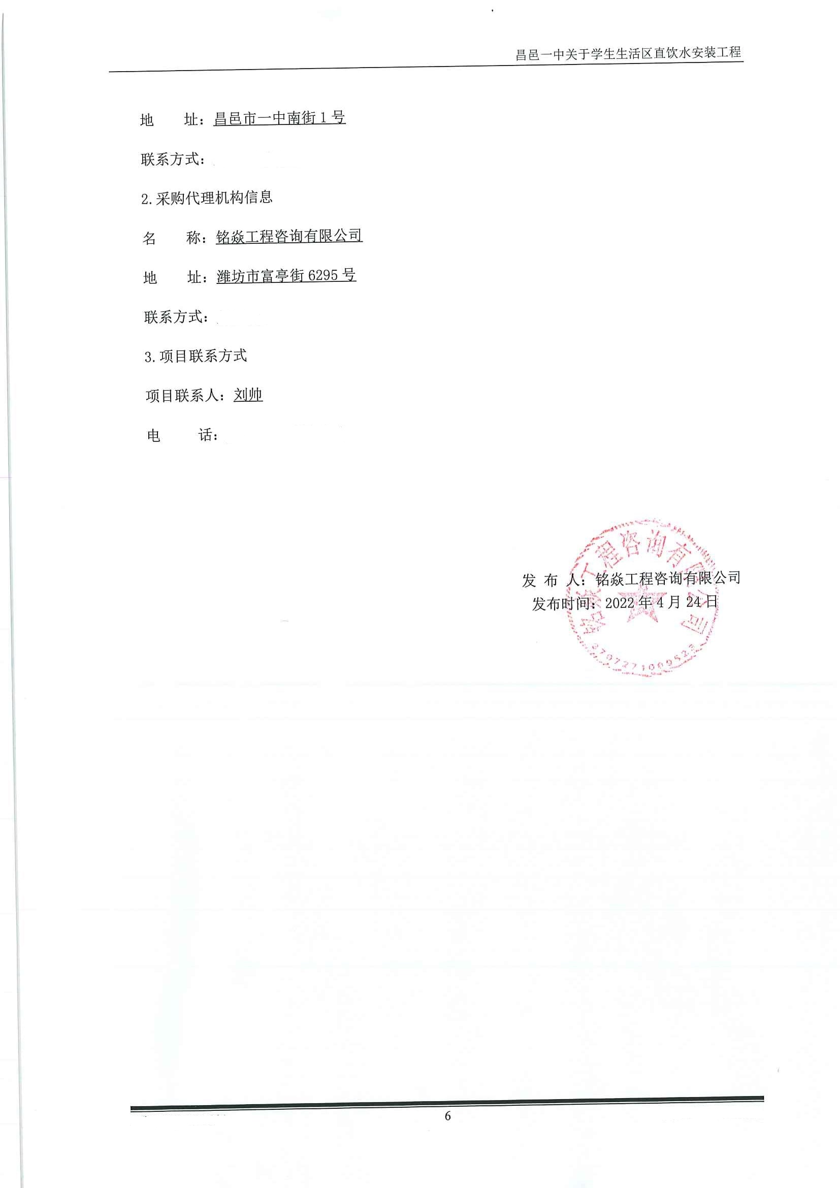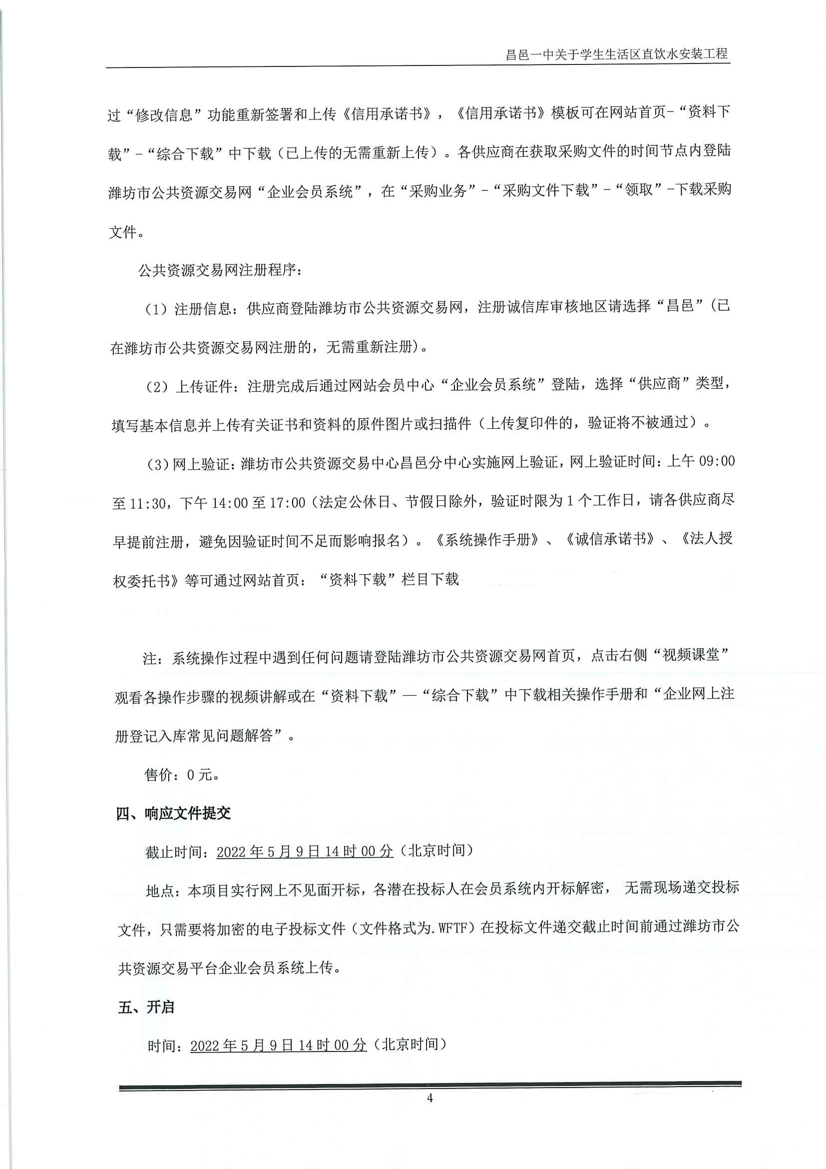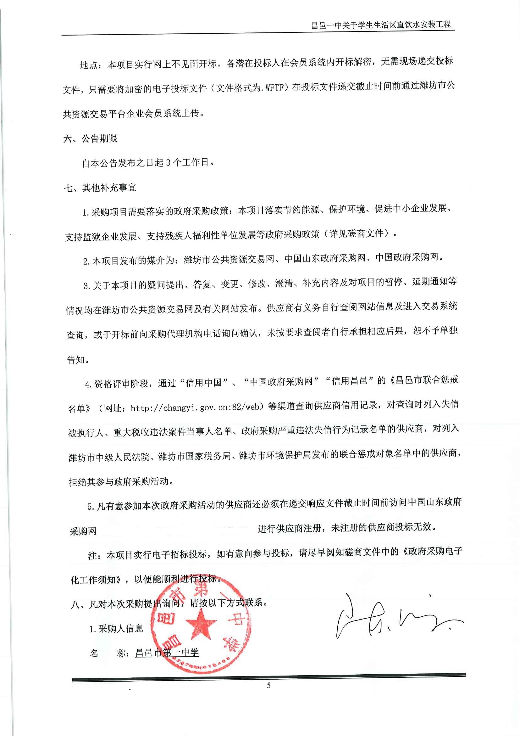 昌邑一中直饮水工程不锈钢管及管件等招标公告