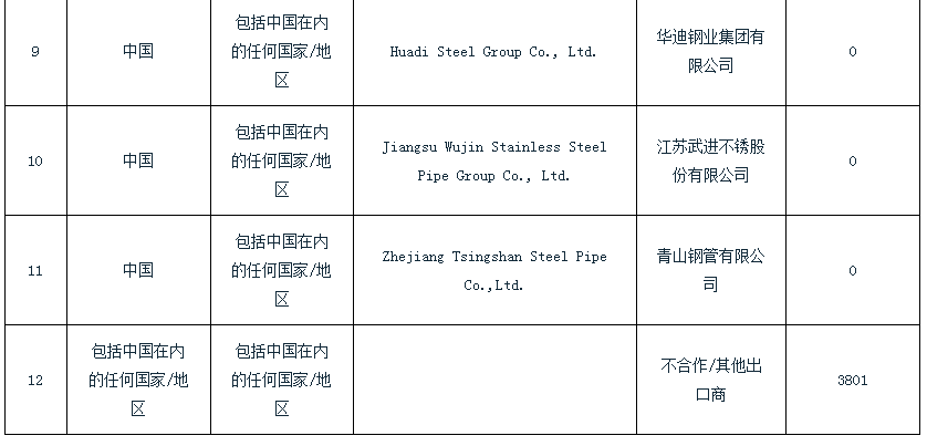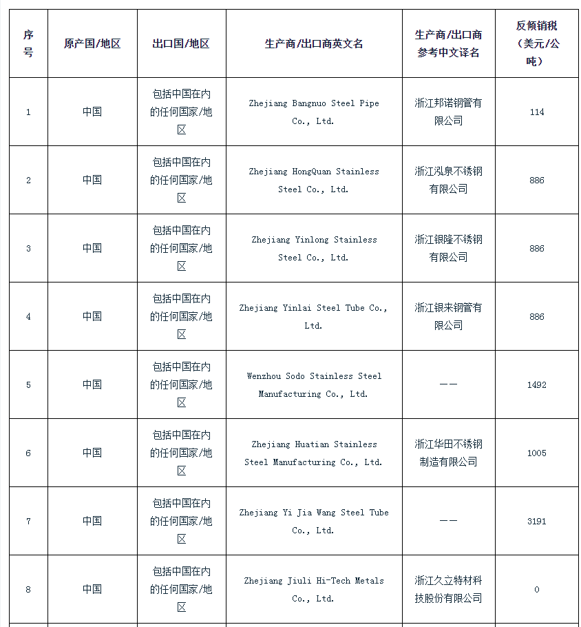 附表:印度对华不锈钢无缝钢管反倾销终裁建议征税表