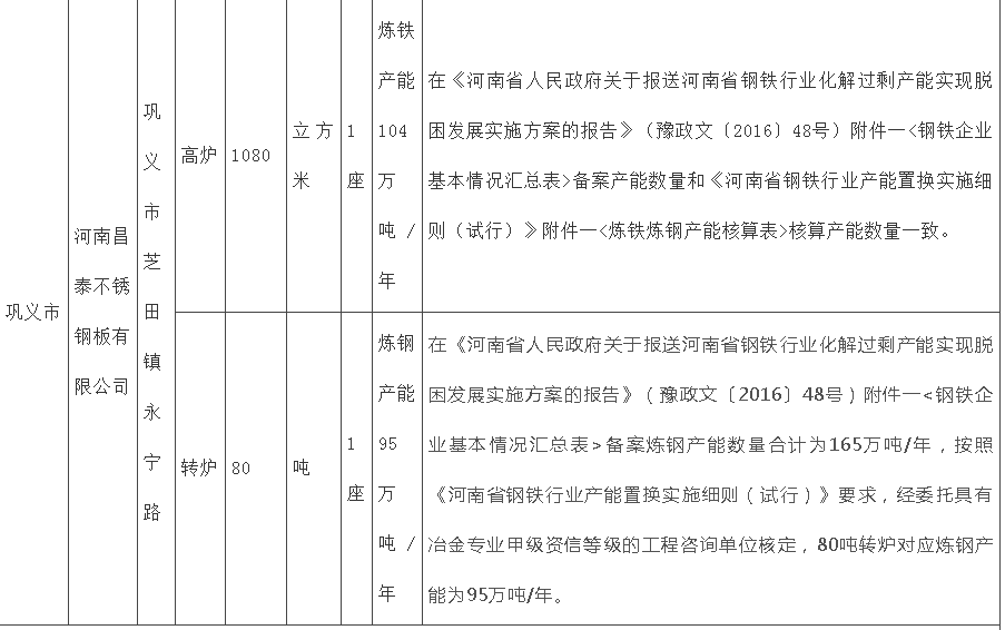据河南巩义市科工信局消息,按照《国务院关于化解产能严重过剩矛盾的指导意见》、《国务院关于钢铁行业化解过剩产能实现脱困发展的意见》、《钢铁行业产能置换实施办法》和《河南省钢铁行业产能置换实施细则(试行)》要求,现将河南昌泰不锈钢板有限公司产能出让情况予以公示,公示时间:2022年11月24日至12月2日。企业情况如下: