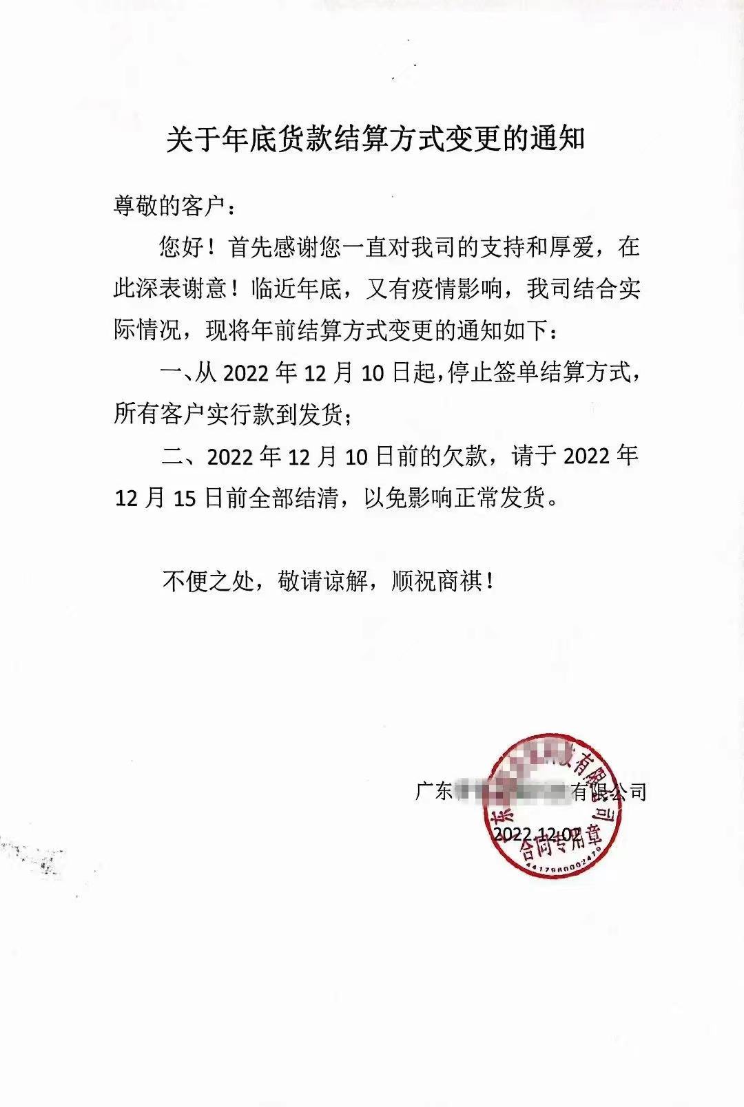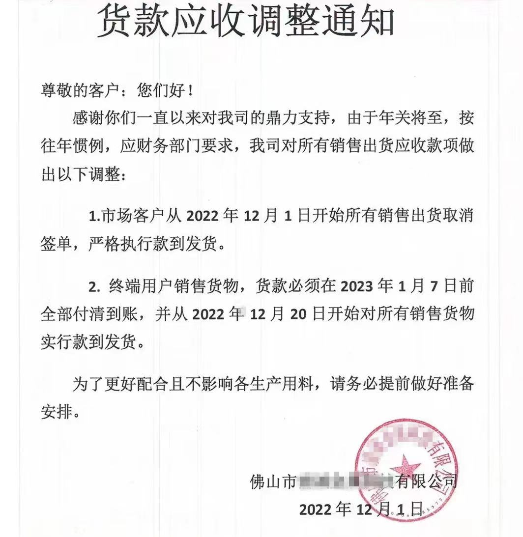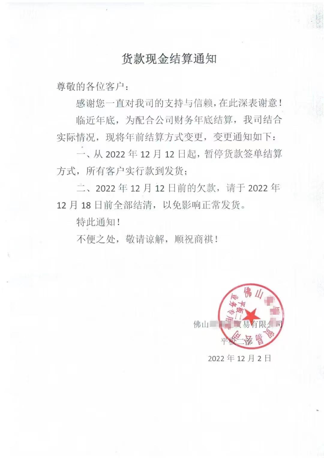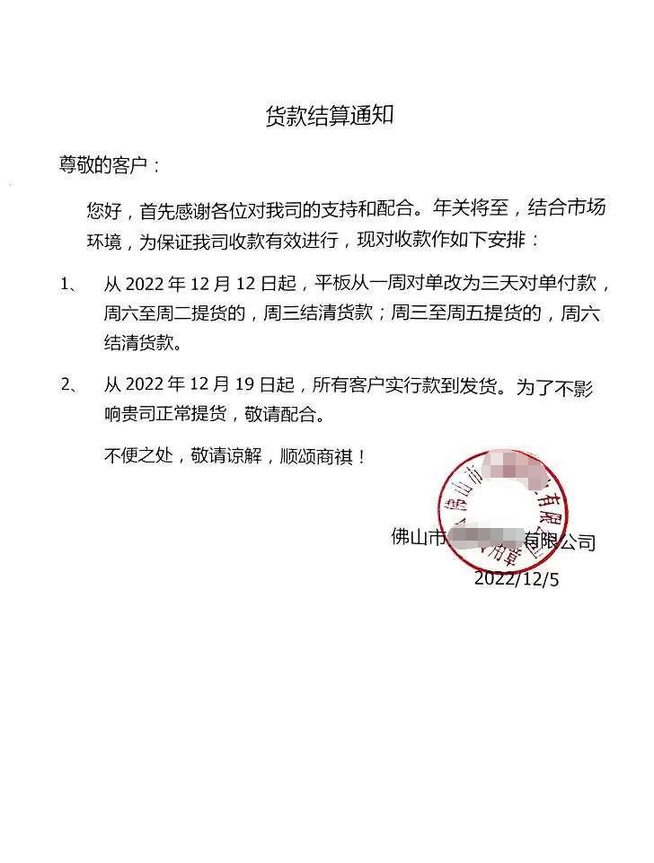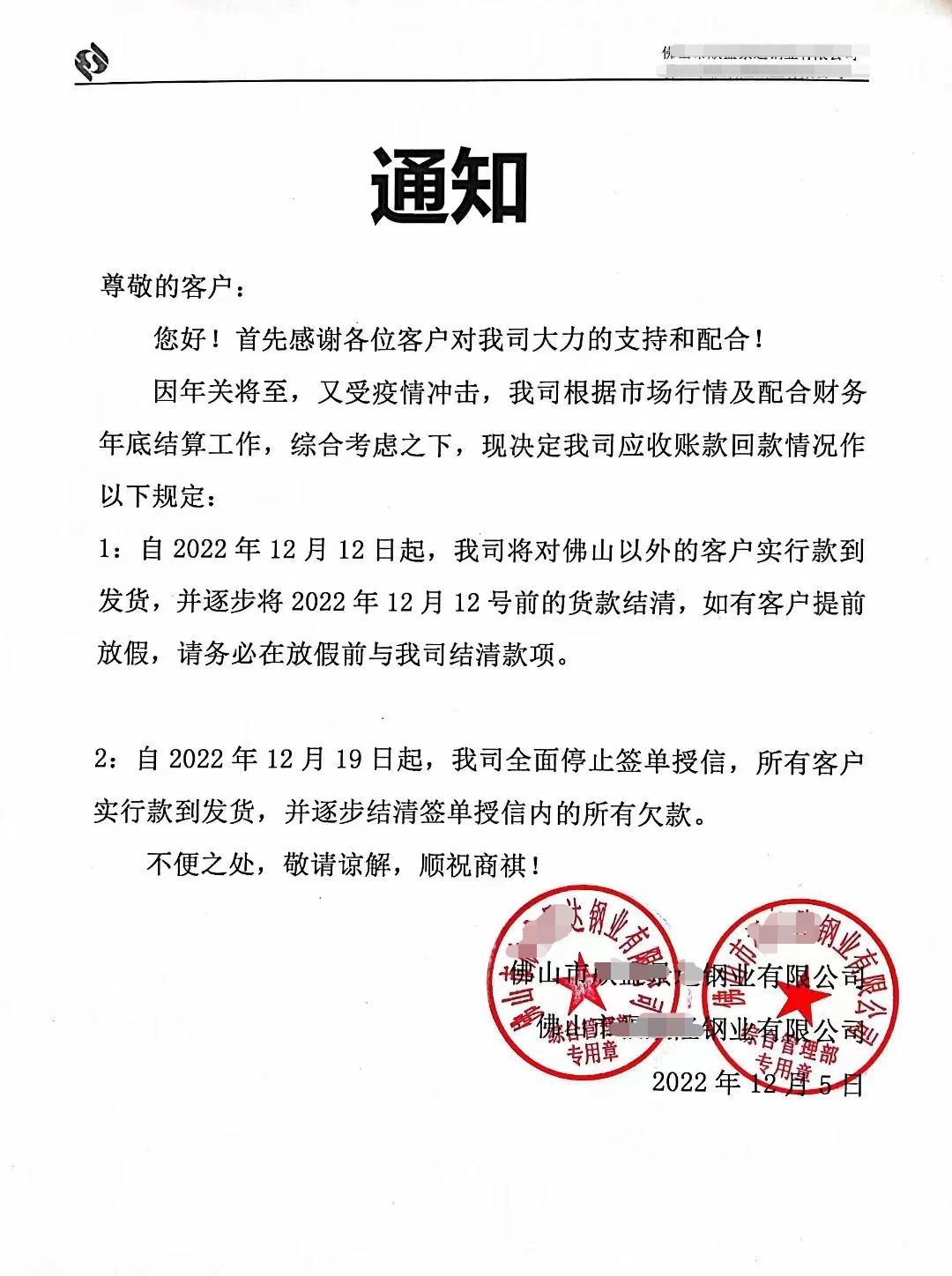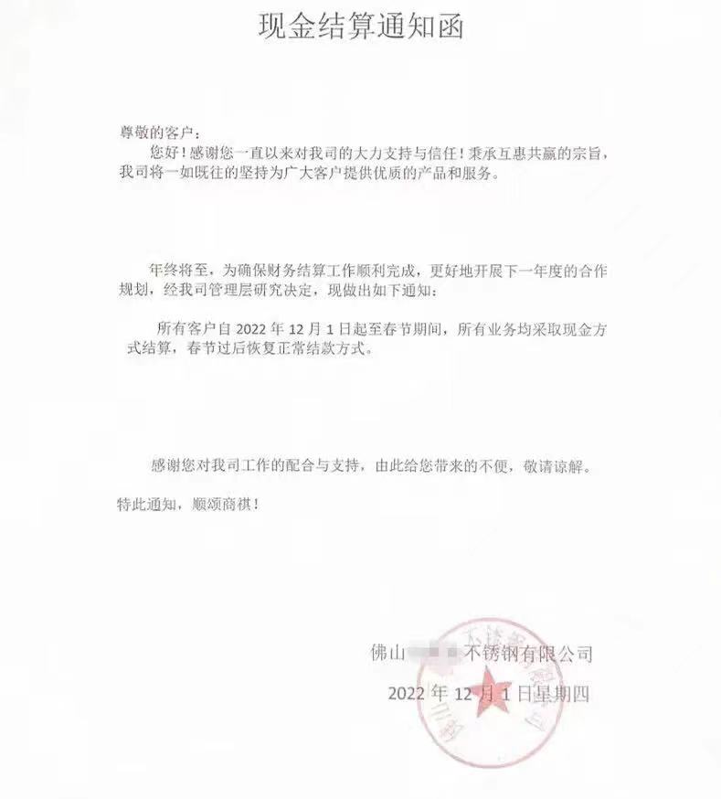 临近年底,佛山地区多家不锈钢企业近日向合作客户发出通知,纷纷对货款结算方式作出调整。