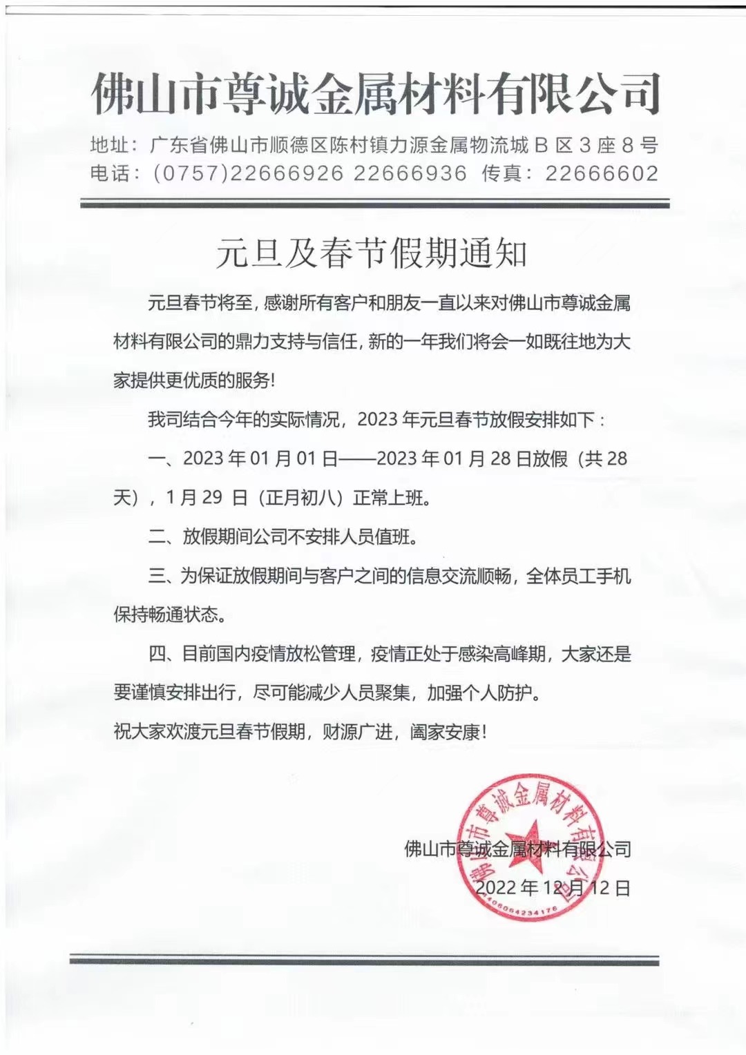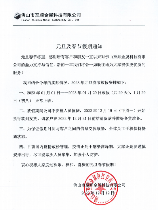 近日,广东省不锈钢材料与制品协会会员单位佛山市至顺金属科技有限公司和佛山市尊诚金属材料有限公司分别发出2023年元旦及春节假期安排的通知。通知显示,其假期时间分别为29天和28天。