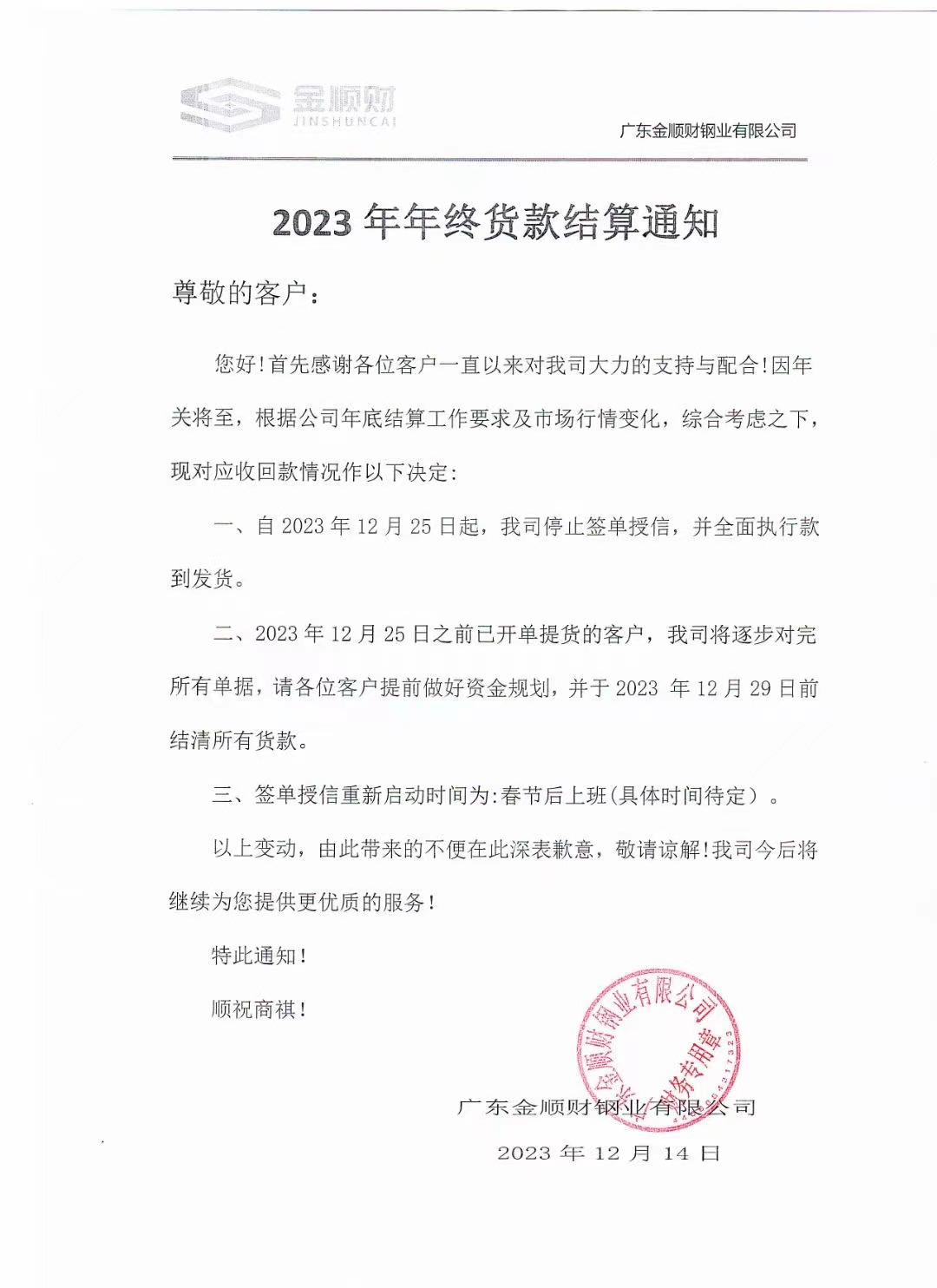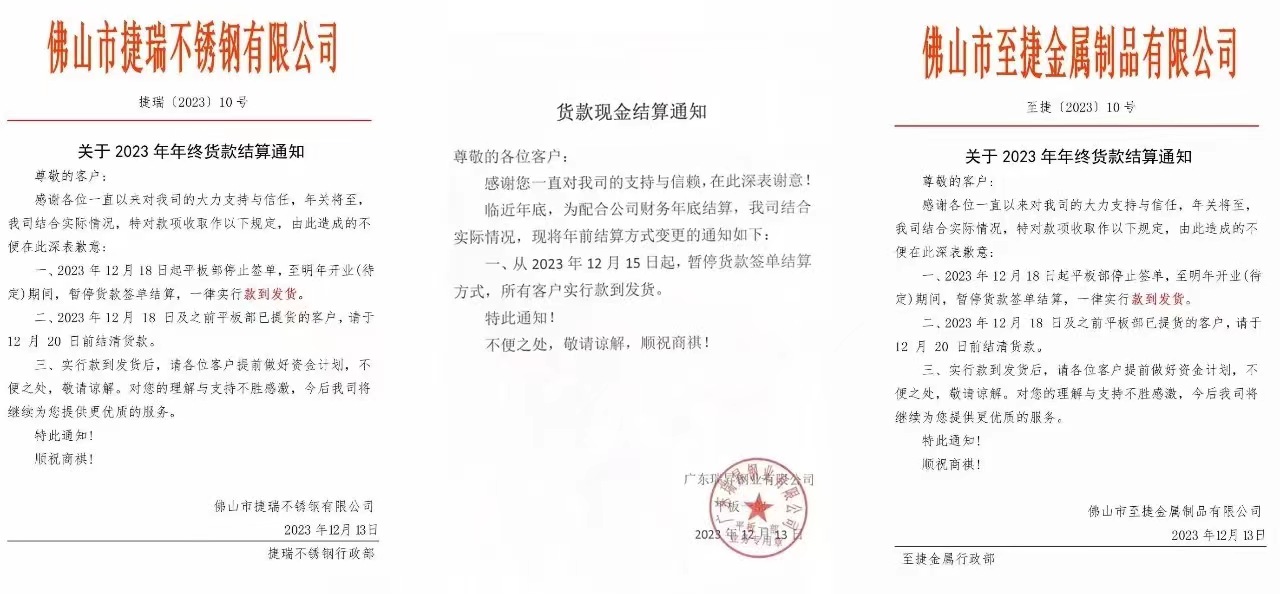临近年底,为规避资金风险,佛山多家不锈钢企业纷纷发出货款结算通知。通知显示,从本月中旬开始,基本上都只接受款到发货!