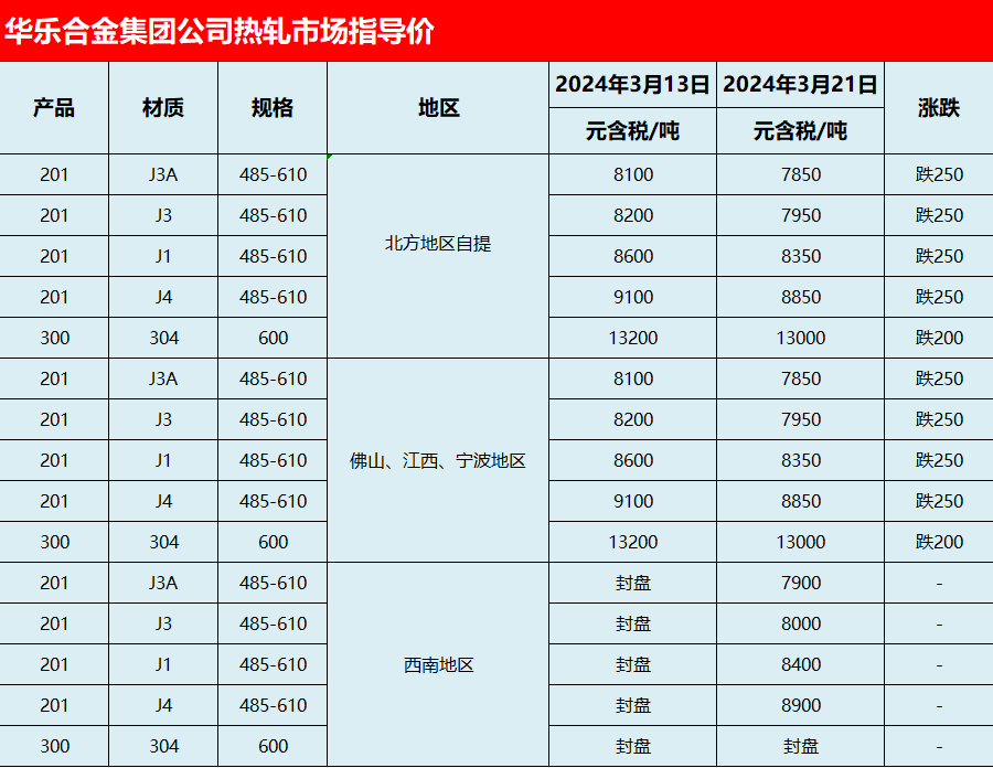 据华乐消息,昨日上午,其开出201、304新盘价。据悉,价格较前期下调200-300元/吨,具体如下: