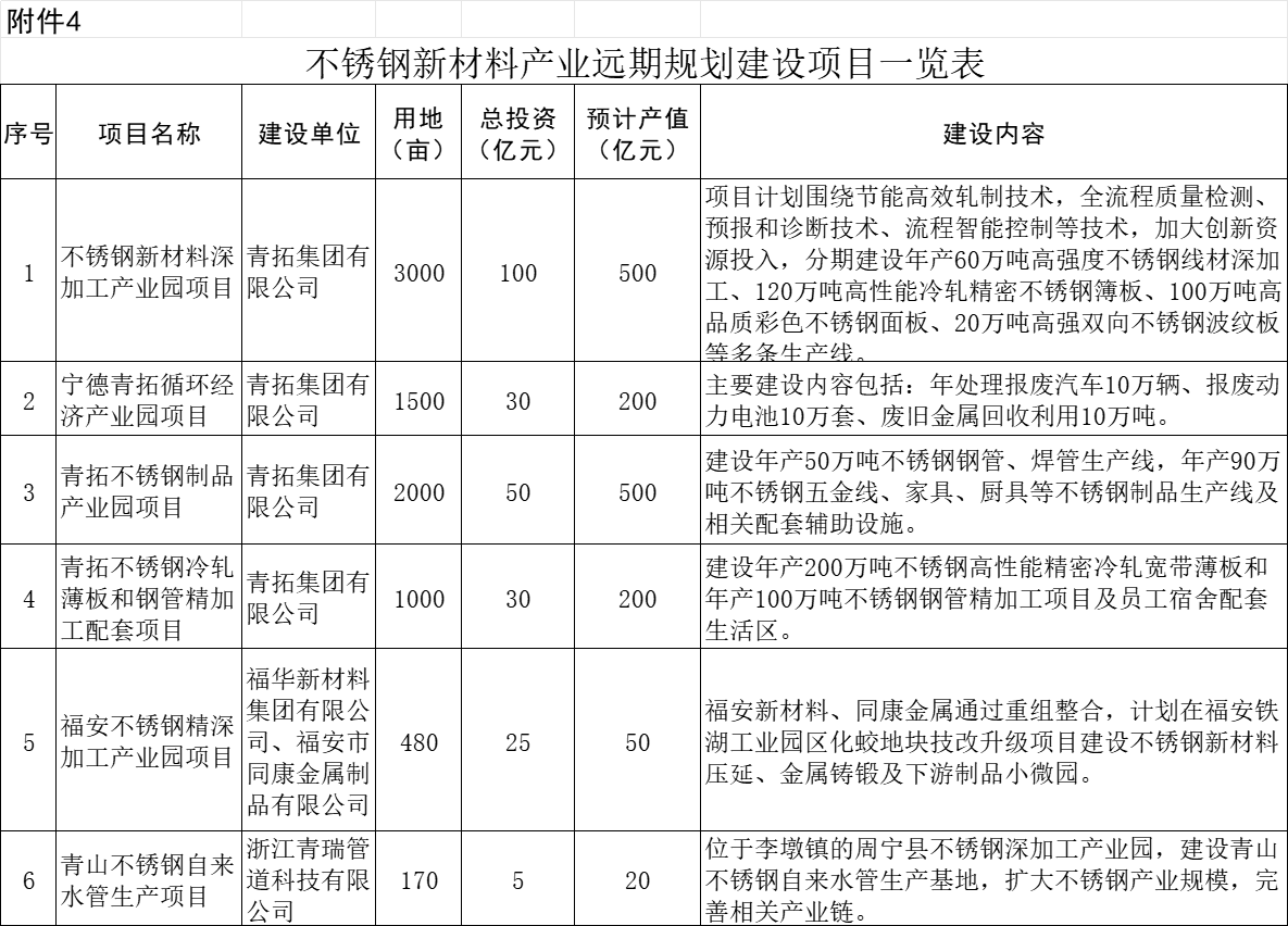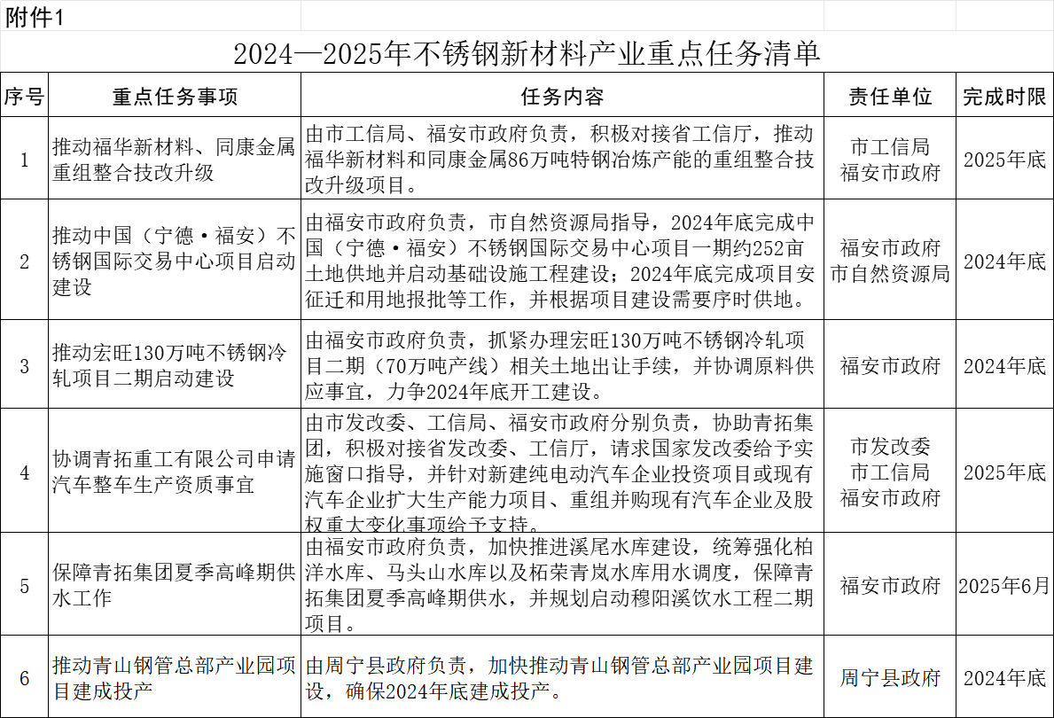 此外,《通知》还详细披露了2024—2025年不锈钢新材料产业重点任务清单、2024—2025年不锈钢新材料产业重点项目一览表、2024—2025年不锈钢新材料产业产城融合配套项目一览表及不锈钢新材料产业远期规划建设项目一览表。
