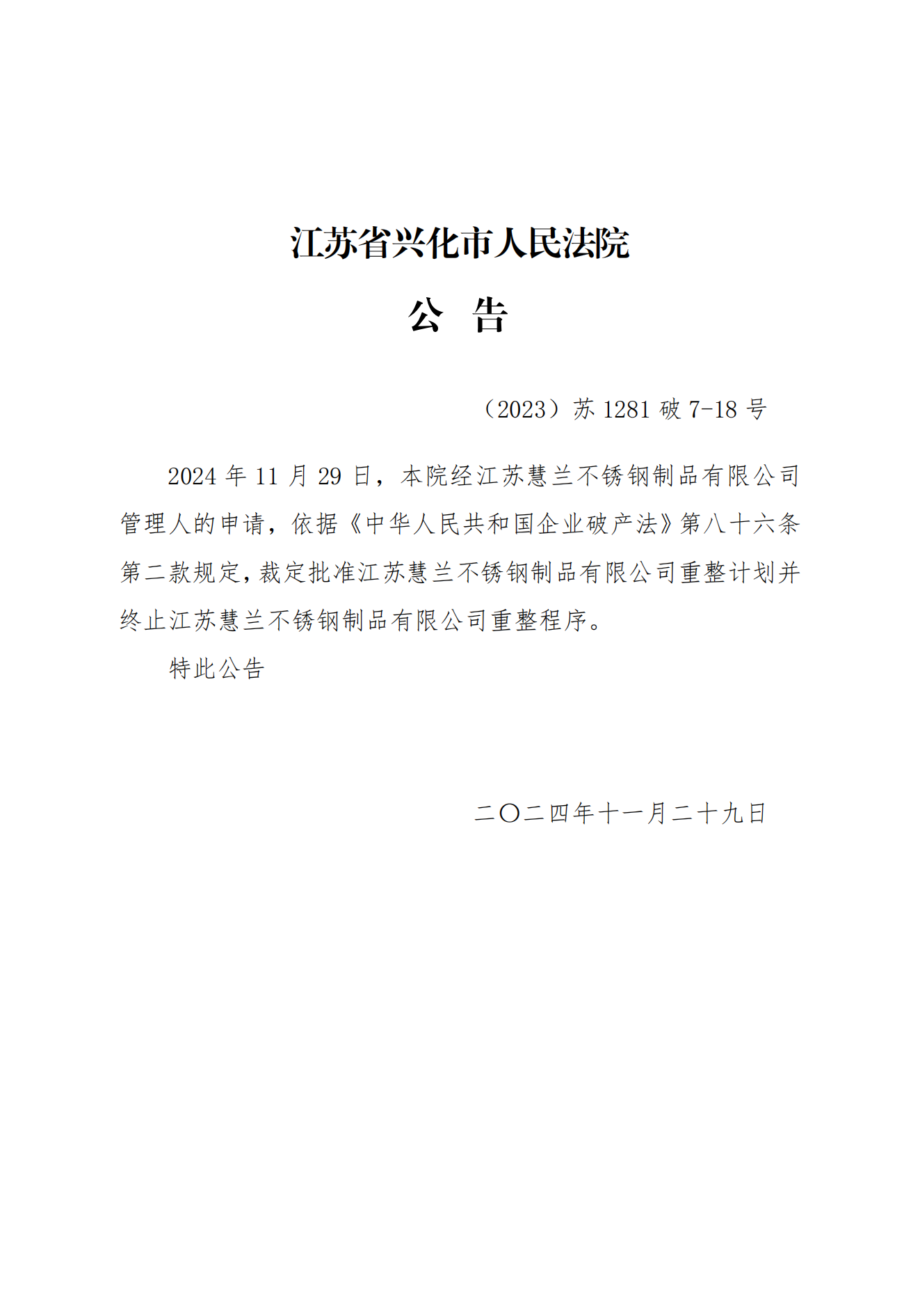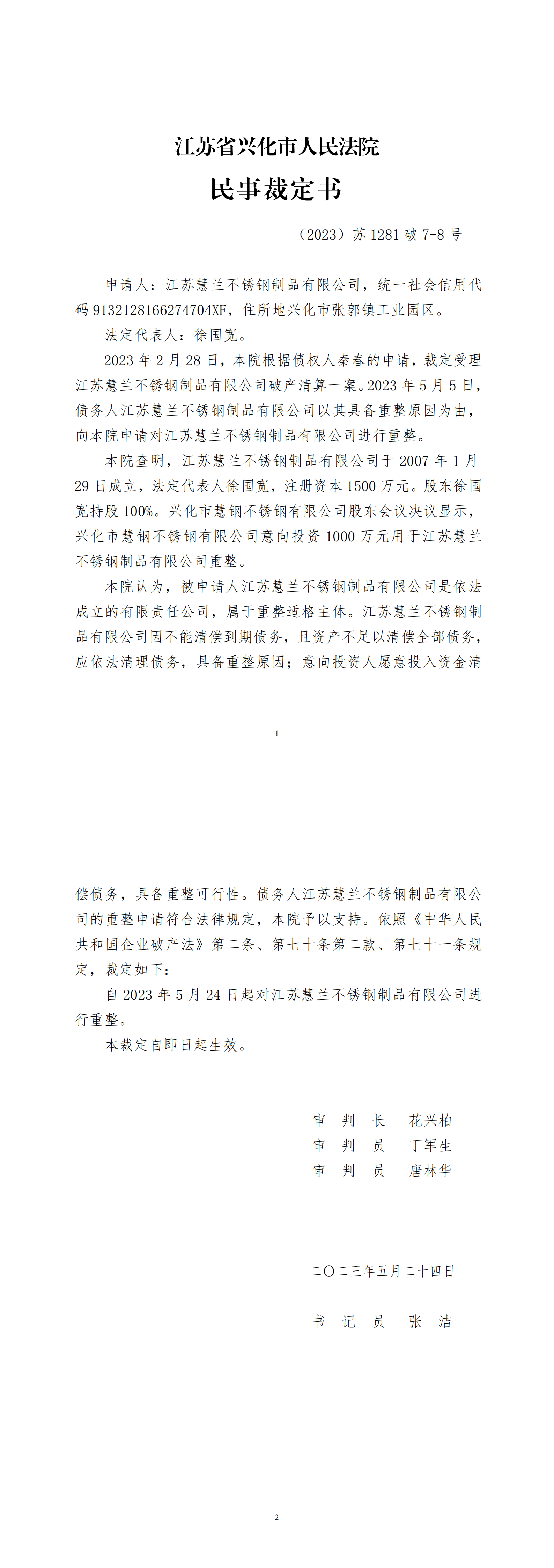 法院裁定批准江苏一不锈钢企业重整计划