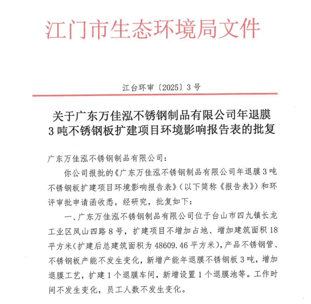 万佳泓不锈钢年退膜3吨不锈钢板扩建项目环评批复