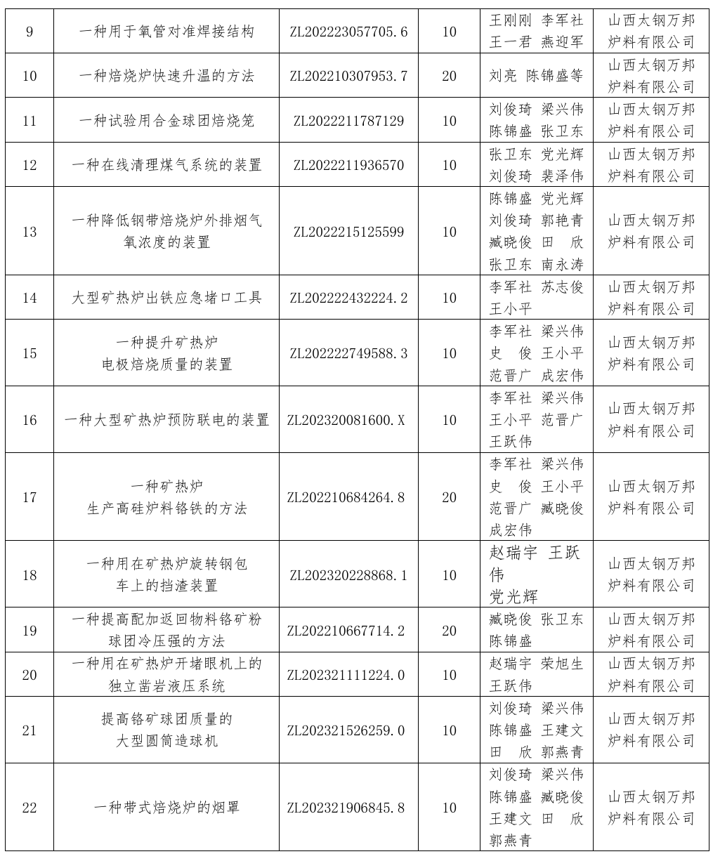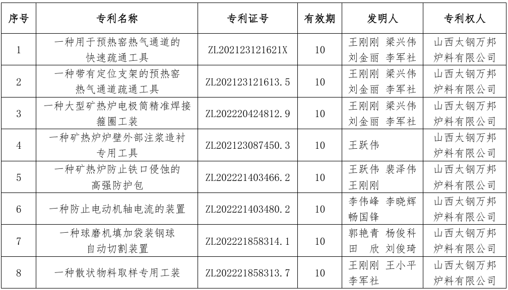 太钢万邦拥有22项专利技术,具体情况如下: