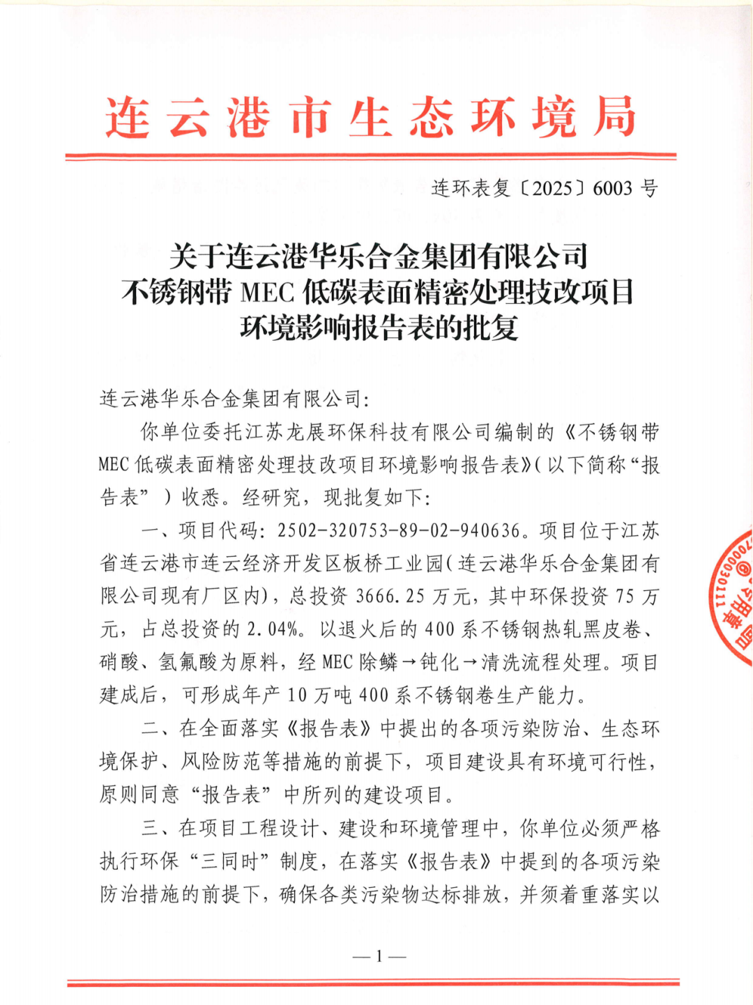 华乐不锈钢MEC低碳表面技改环评报告表批复