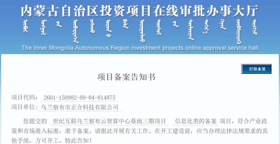 近日,内蒙古乌兰察布市察哈尔高新技术开发区管委会经济发展和投资促进局通过世纪互联乌兰察布云智算中心基地三期项目备案。