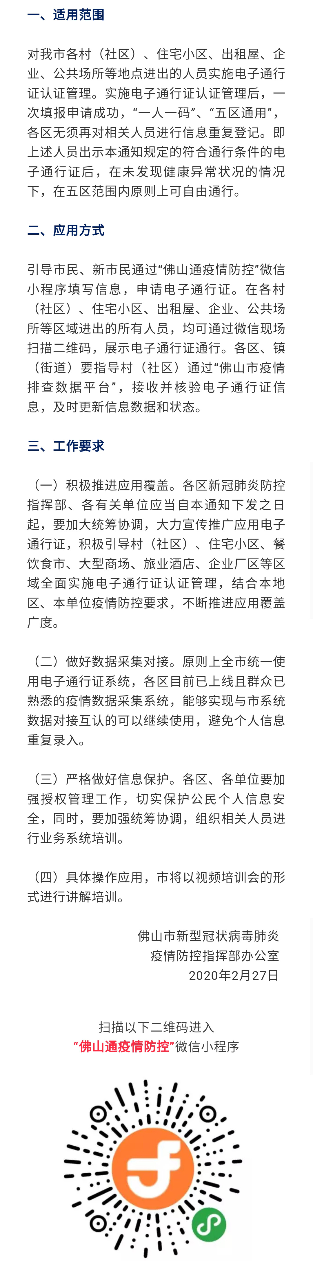 佛山市新型冠状病毒肺炎疫情防控指挥部办公室关于推广应用电子通行证的通知