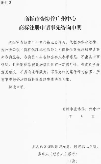 附件2:商标审查协作广州中心商标注册申请事先咨询申明