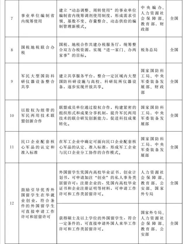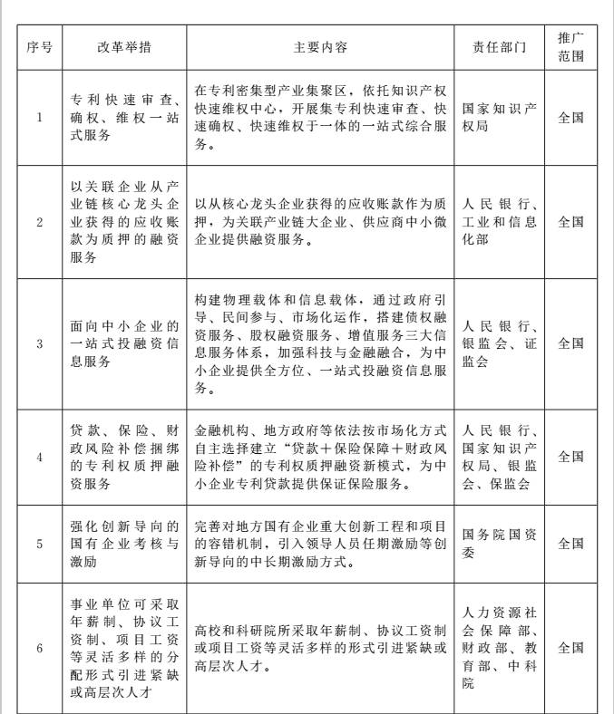 为深入实施创新驱动发展战略,党中央、国务院确定在京津冀、上海、广东(珠三角)、安徽(合芜蚌)、四川(成德绵)、湖北武汉、陕西西安、辽宁沈阳等8个区域开展全面创新改革试验,推进相关改革举措先行先试,着力破除制约创新发展的体制机制障碍。有关地区和部门认真落实党中央、国务院决策部署,在深化科技体制改革、提升自主创新能力、优化创新创业环境等方面进行了大胆探索,形成了一批支持创新的相关改革举措。为进一步加大支持创新的力度,营造有利于大众创业、万众创新的制度环境和公平竞争市场环境,为创新发展提供更加优质的服务,经国务院批准,将有关改革举措在全国或8个改革试验区域内推广。现就有关事项通知如下: