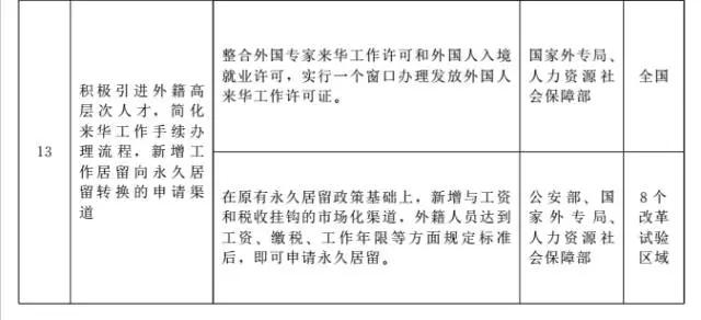 (三)外籍人才引进方面2项:“鼓励引导优秀外国留学生在华就业创业,符合条件的外国留学生可直接申请工作许可和居留许可”、“积极引进外籍高层次人才,简化来华工作手续办理流程,新增工作居留向永久居留转换的申请渠道”。
